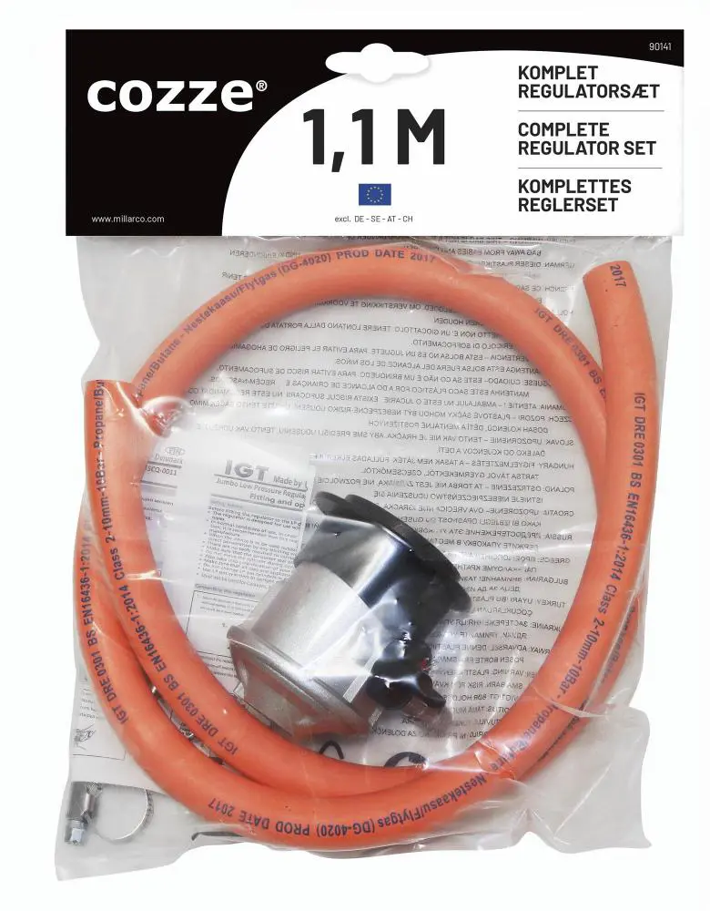 - Þrýstijafnari Cozze f/ 30mbar smellugas 1,1m slanga