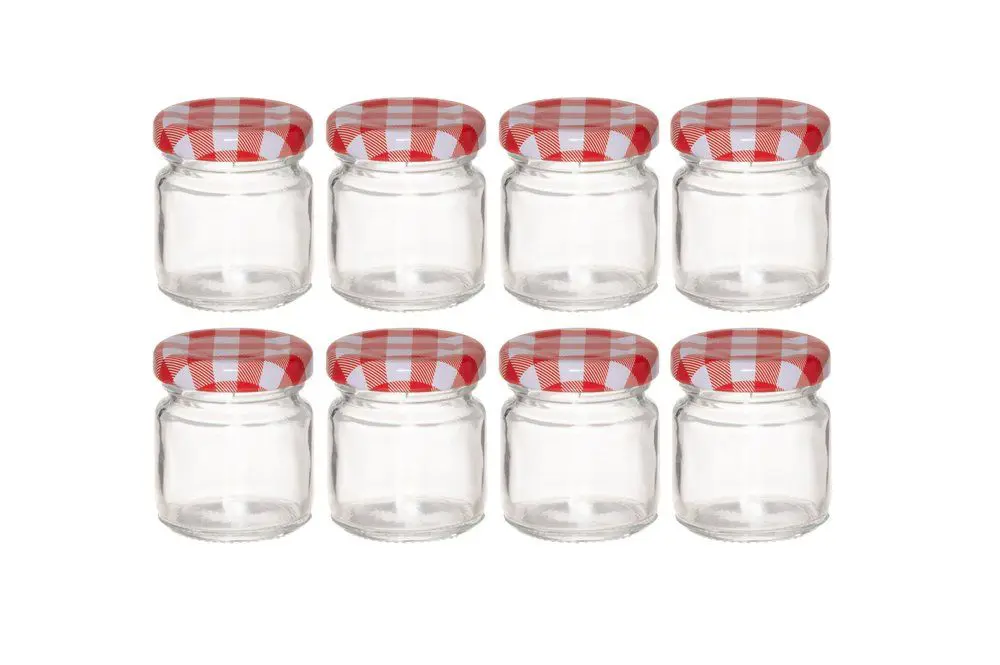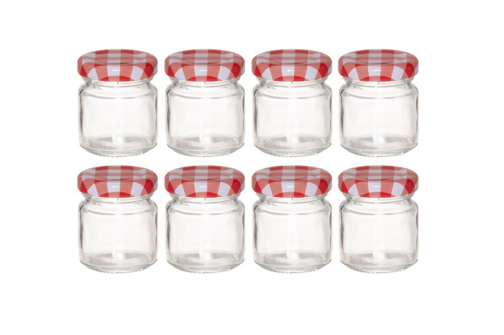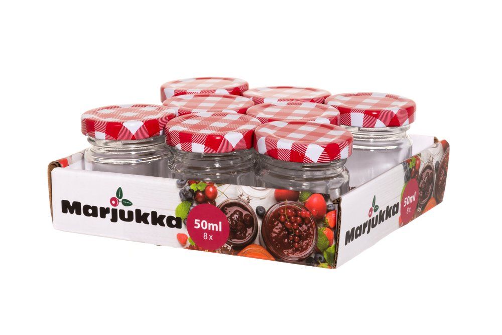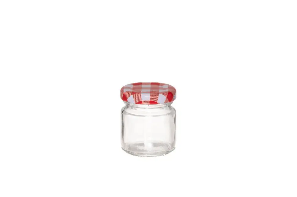 Klassísk sultukrukka með rauðu og hvítu köflóttu málmloki. Litla krukkan er fullkomin til að sjóða niður sultu til að nota með ostum. Rúmmál 50 ml. Loki handþvottur. Krukkurnar mega fara í uppþvottavél.