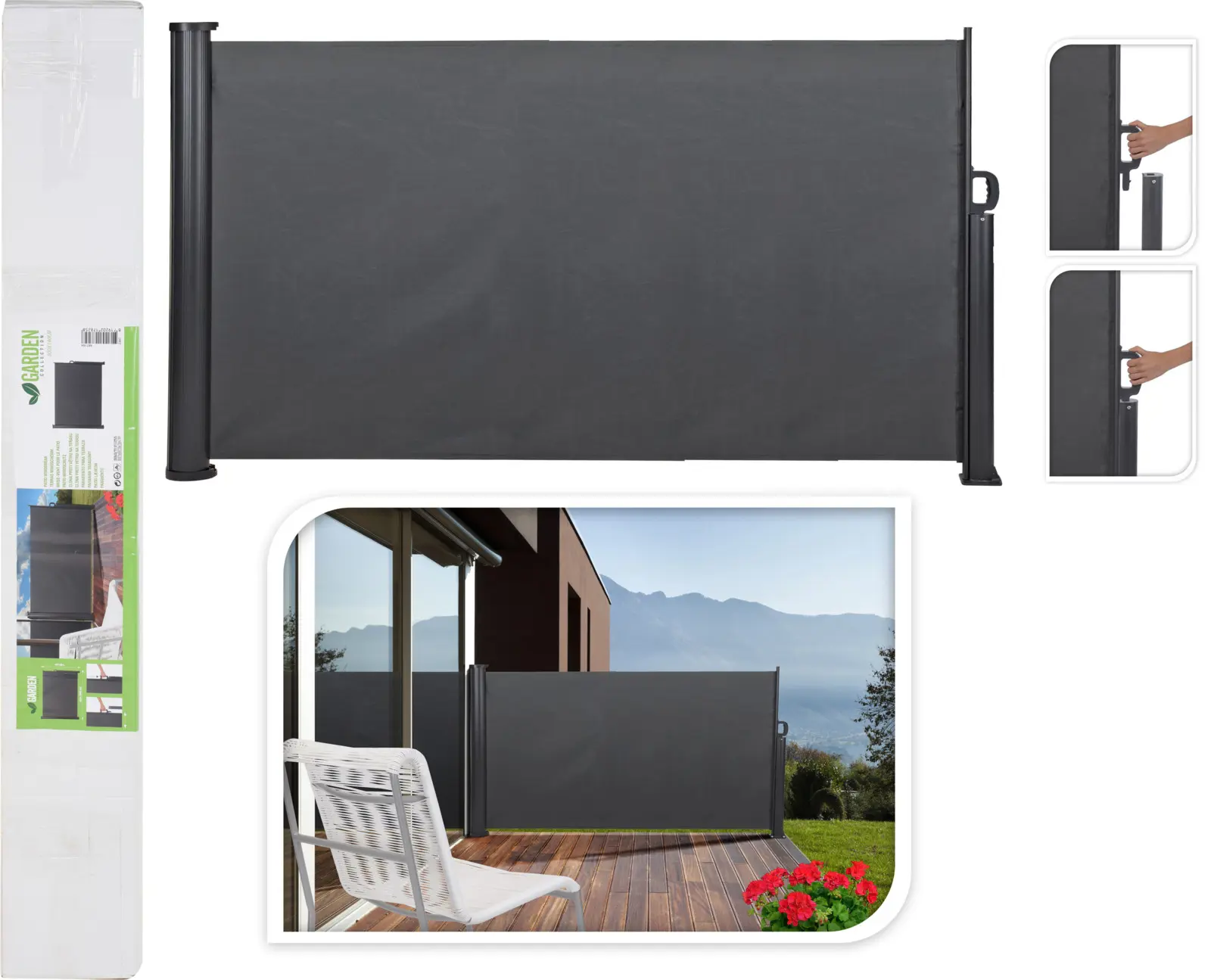 Útdraganlegur skjólveggur 300x160cm, dökkgrár að lit. Pólýester efni 220 gr/m2. Vatnsfráhindrandi.