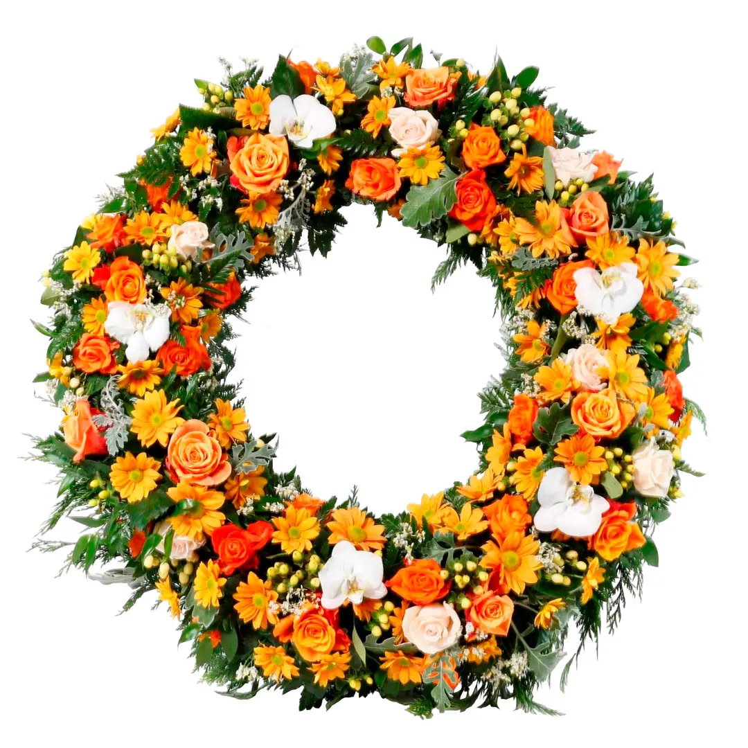 Hringskreyttur útfararkrans með mismunandi appelsínugulum og ljósum blómum. Innifalið í verði er áletraður borði og akstur í kirkju. 60cm undirlag.