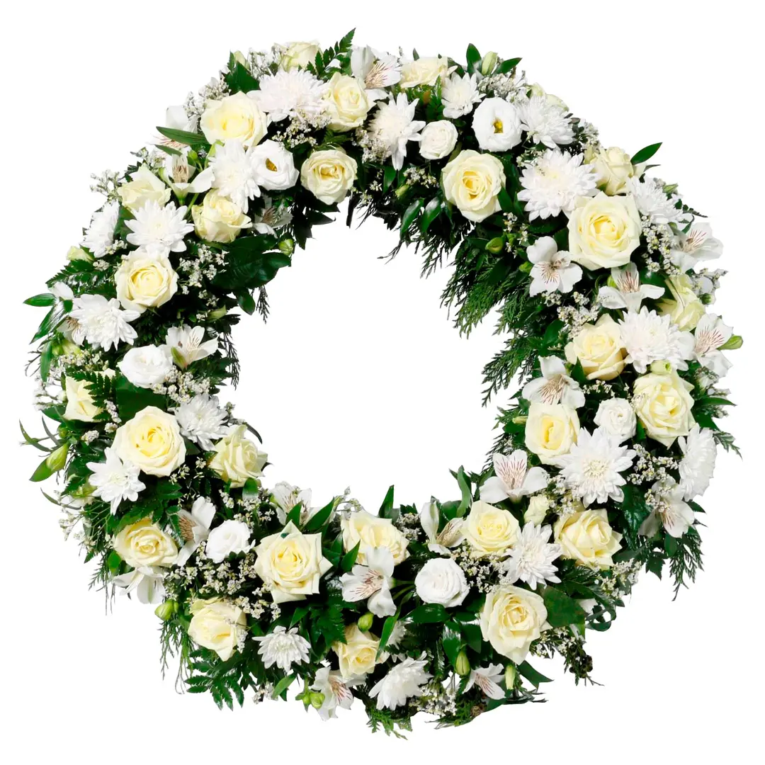 Hringskreyttur útfararkrans með hvítum rósum og hvítum krýsa ásamt mismunandi hvítum blómum. Innifalið í verði er áletraður borði og akstur í kirkju. 60cm undirlag.