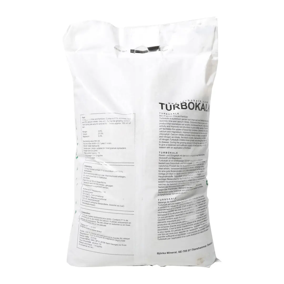 Áburðarbætt Turbokalk Gott er að nota Blákorn og Turbokalk á fallegar grasflatir í upphafi vaxtartímans á vorin, fyrst Turbo kalk til að hlutleysa jarðveginn og síðan Blákorn eftir 5–7 daga. Berið Turbokalk á þrisvar sinnum fram í miðjan júlí. Það eykur mótstöðuafl plantna gegn sjúkdómum og vinnur gegn vexti mosa. Þá bætir Turbo kalk jarðvegsbygginguna og auðveldar loftun jarðvegsins. Efnainnihald: Dólómítakalk (CaCO3 / MgCO3) 77,0% Kalksaltpétur ..........................23,0% samt....100,0 % Í Dólomítkalki og Kalksaltpétur eru eftirfarandi efni: Kalsíum (Ca) 21,0% Magnesíum (Mg) 9,3% Köfnunarefni (N) 3,6%