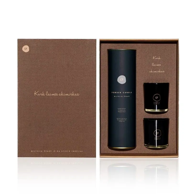 The set includes: powder candle, 20 wicks, two black glass jars