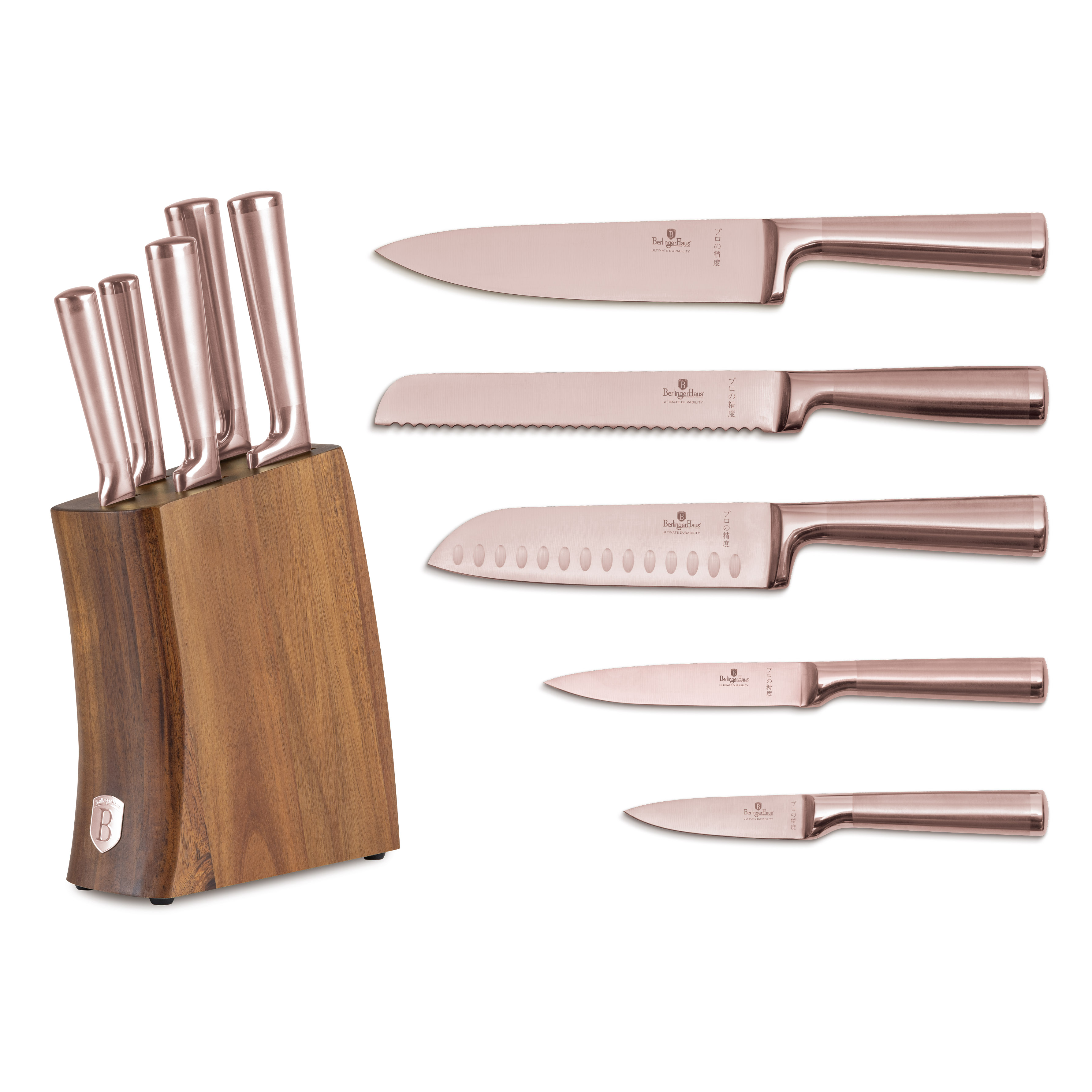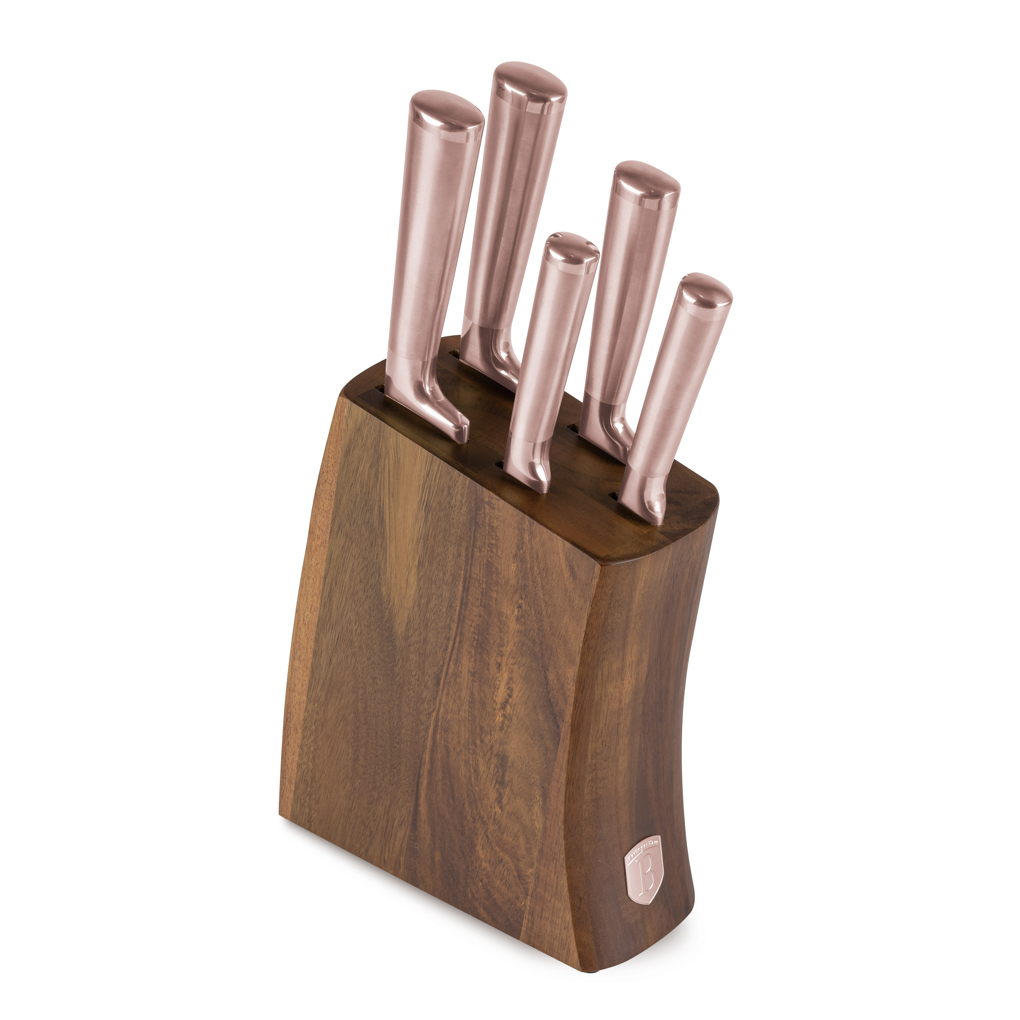 Berlinger Haus 6-stykkja hnífasett með akasíuviðarstandi sameinar nákvæmni, virkni og lúxus. Hannað fyrir þá sem meta bæði frammistöðu og fagurfræði eldhúsverkfæra sinna. Þetta sett er með hágæða hnífa úr ryðfríu stáli með töfrandi rósagulla áferð.