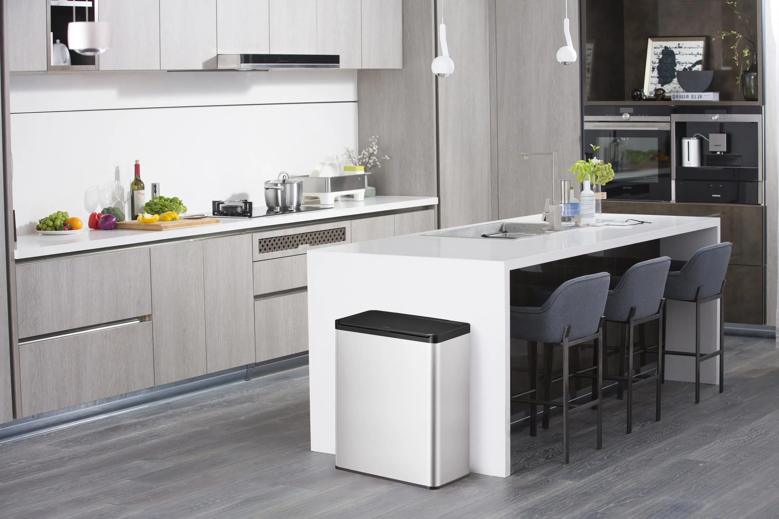 Stílhrein ruslafata úr riðfríu stáli með tveimur 20 lítra hólfum.