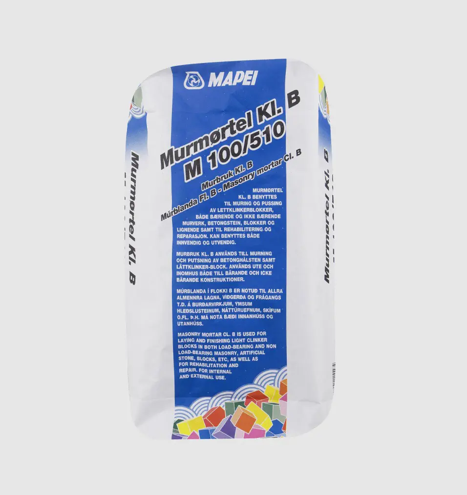 Mapei Múr Kl. B (Murmørtel M100/510) er sementsbundinn þurrmúr sem þarf einungis að blanda með vatni. Múrinn er í flokki M5 (áður þekktur sem B-múr) og hentar einkar vel til hleðslu á ýmsum byggingarefnum, svo sem Leca, vikurkubbum, múrsteini, steinsteypukubbum og náttúrusteini.