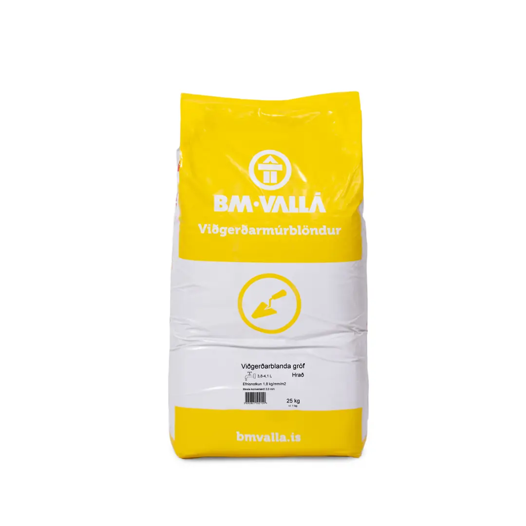 BM Vallá Viðgerðarblanda Gróf er trefjastyrkt og hraðharðnandi viðgerðarefni sem er hannað fyrir viðgerðir á steypu þar sem þörf er á miklum styrk og þykkt. Blandan er tilbúin til notkunar og þarf einungis að blanda með vatni. Hún hentar sérstaklega vel til að gera við uppsagaðar sprungur, kanta, tröppur og stærri skemmdir á bæði láréttum og lóðréttum flötum.