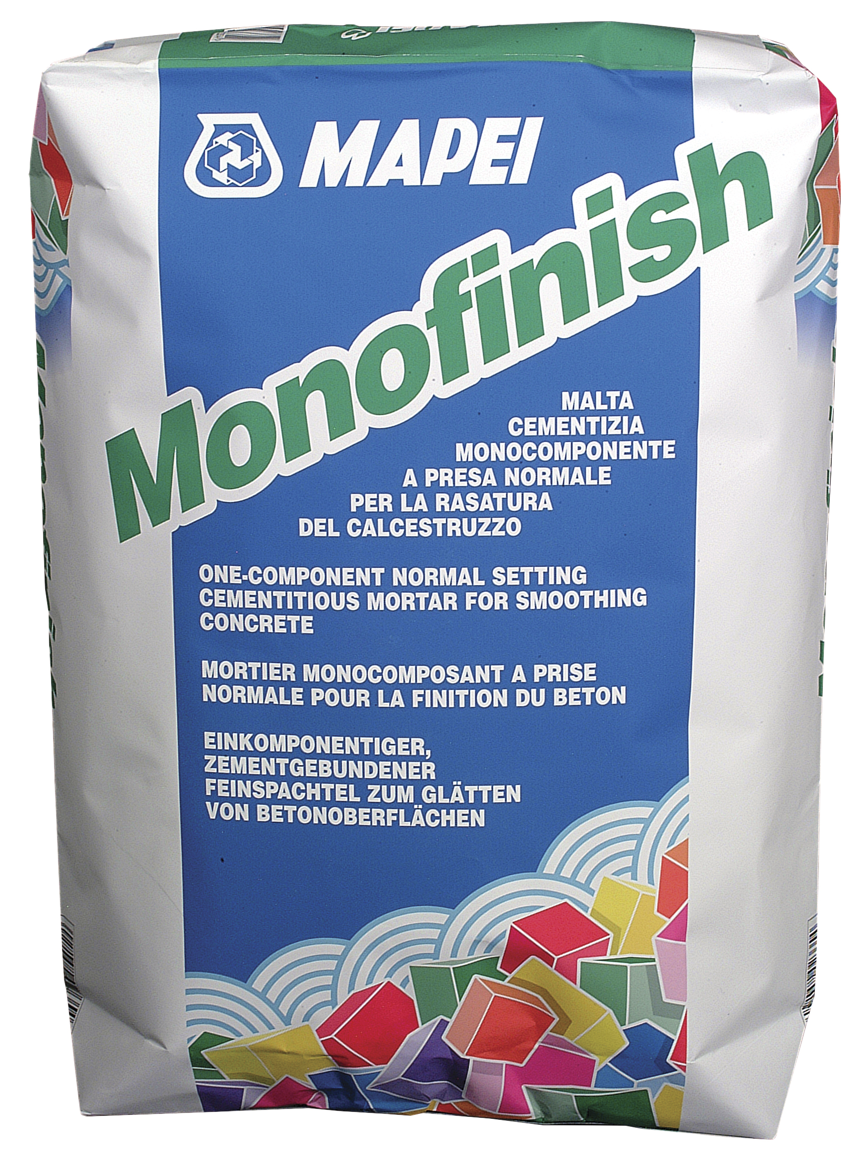 Notkunarsvið: Til að vernda og fínpússa steypt yfirborð. Damigerð notkun: Til að slétta ójöfnur á steypum flötum fyrir málningu. Til að fínpússa viðgerða fleti þar sem notuð hafa verið MAPEGROUT viðgerðarefni. Til að jafna og fínpússa örður á áður múruðum flötum. Eiginleikar: MONOFINISH er duftkenndur og mjög styrkur eins-þáttar sementsbundinn múr með sérvöldum, fíngerðum sandi og vatnsleysanlegum fjölliðum samkvæmt formúlu sem þróuð hefur verið á rannsóknarstofu MAPEI. Þegar efnið er blandað vatni myndar þar fljótandi múrefni sem auðvelt er að draga á bæði lóðrétta og lárétta fleti í þykkt frá 2 til 3 mm í hverri umferð. Vegna mikils inni- halds fjölliða nær múrinn frábærri viðloðun á alla steypa fleti og myndar hart og sterkt yfirborð við fulla hörðnun.