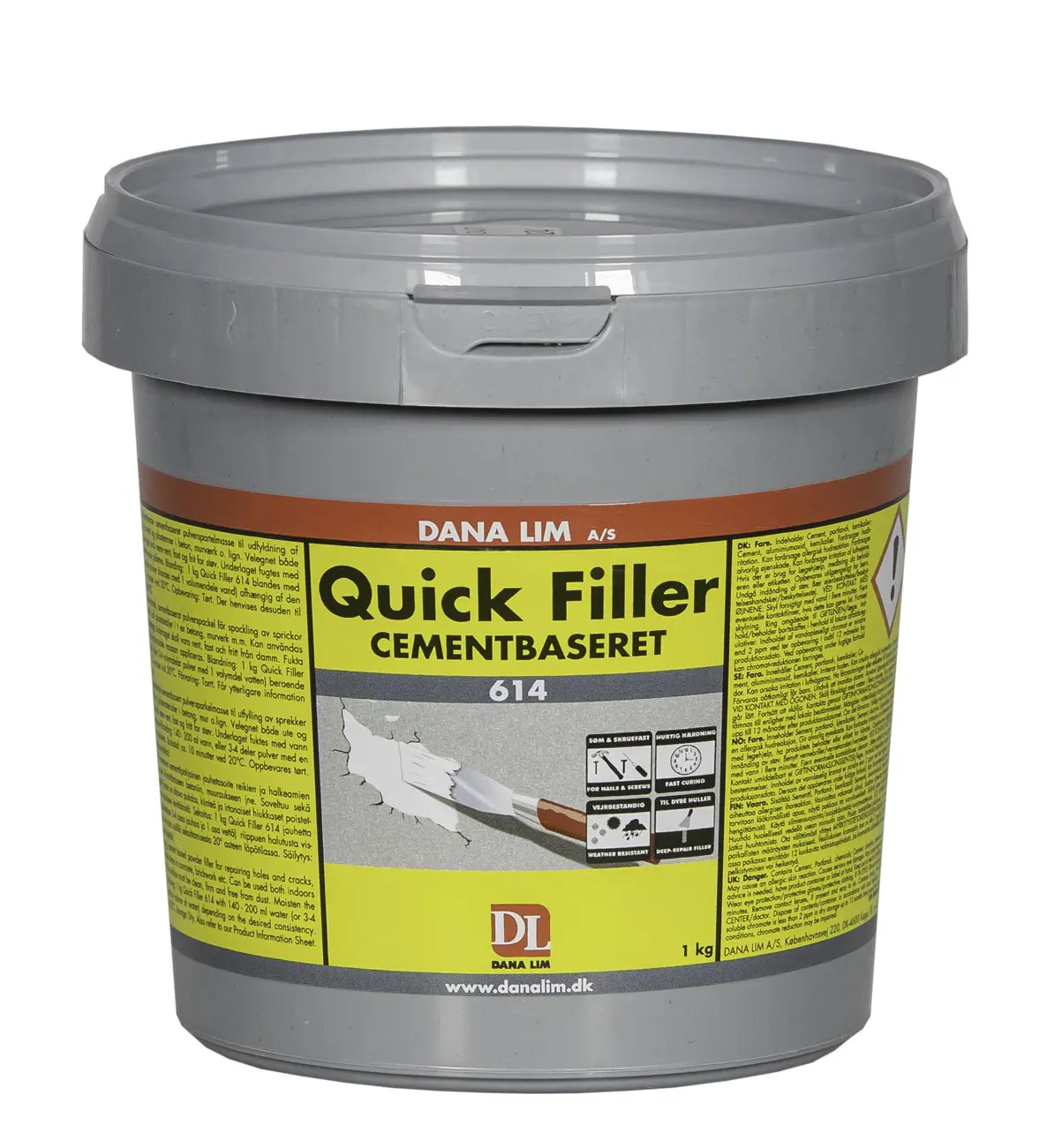 Dana Lim Quick Filler 614 er hraðþornandi og vatnshelt sementbundið duftfylliefni sem er hannað fyrir viðgerðir á sprungum, holum og ójöfnum. Efnið hentar jafnt til notkunar innanhúss sem utan og festist vel við flest hefðbundin byggingarefni, þar á meðal steypu, múr, léttsteypu, gips og tréplötur.
