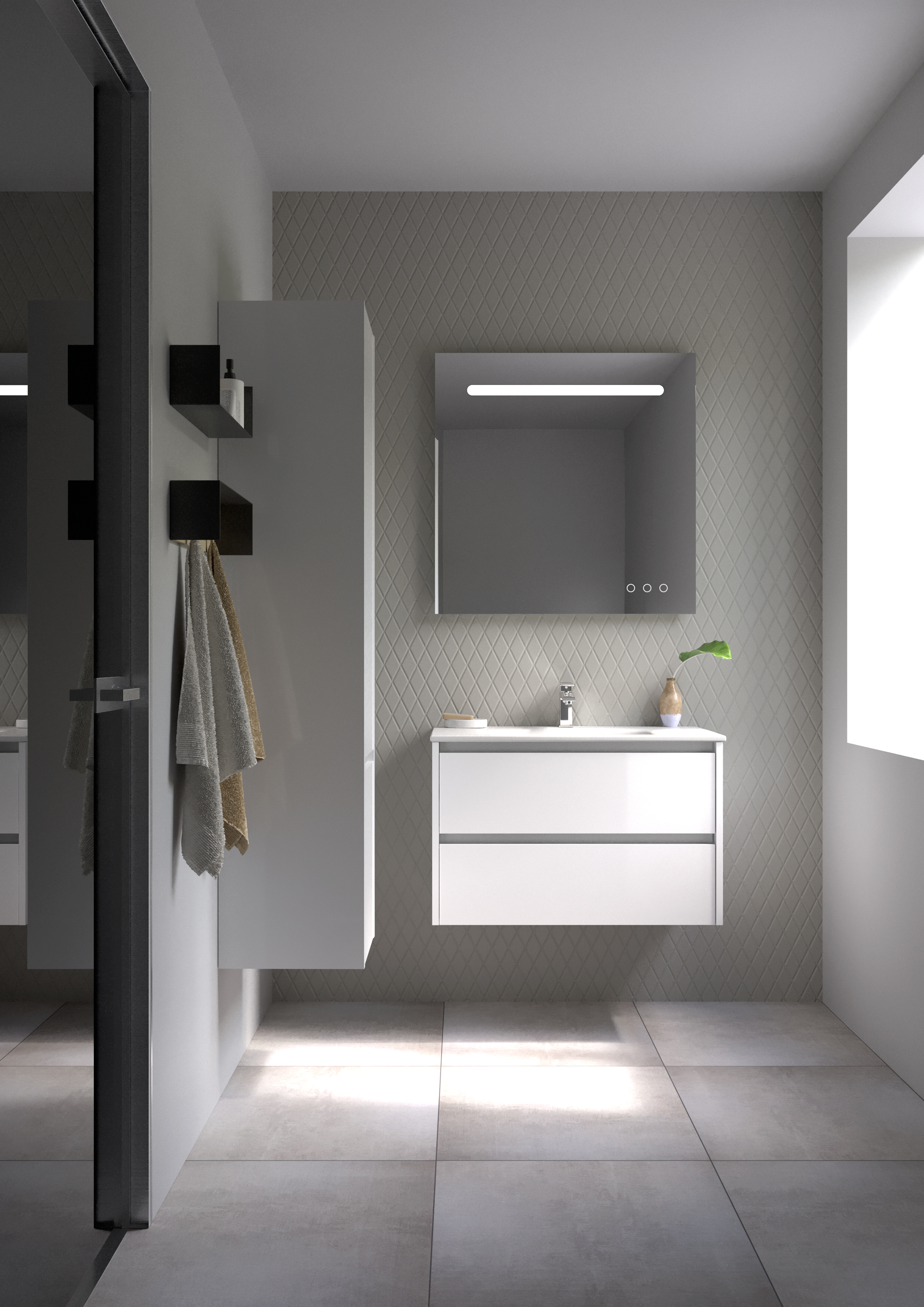 - Geymsla: Tvær hurðir með rúmgóðum hillum fyrir snyrtivörur og handklæði.