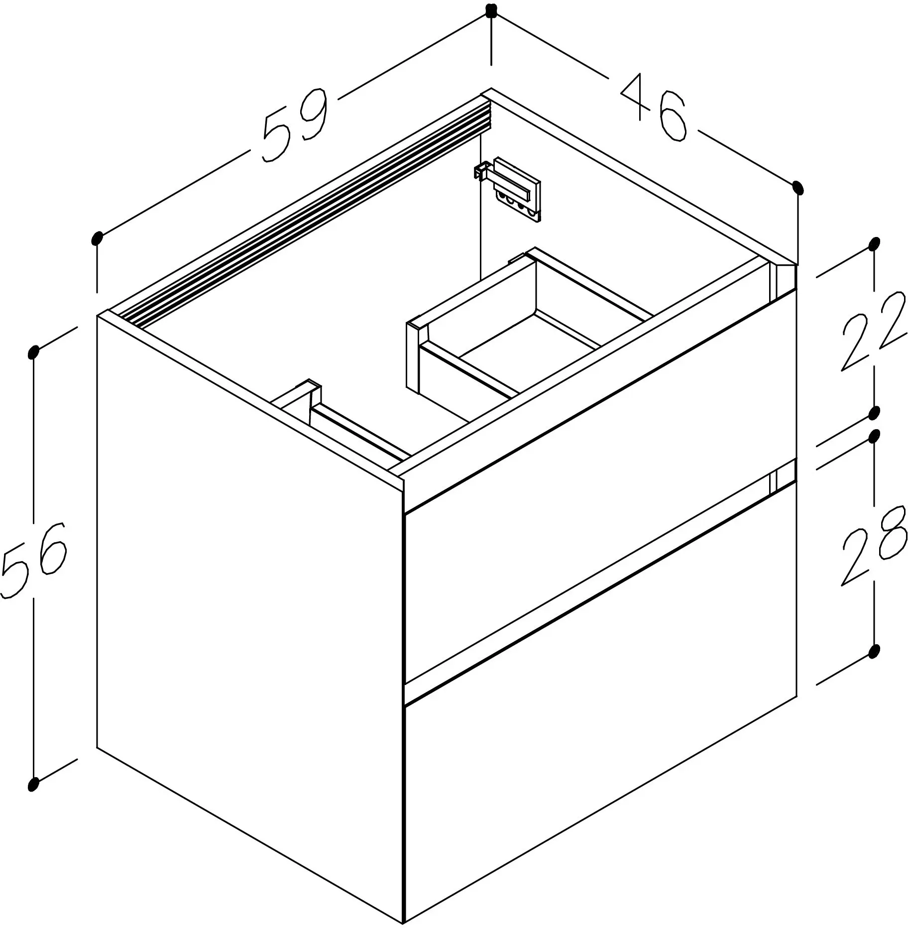 Vandaður vaskaskápur með tveim mjúklokandi skúffum. Hentar vel í minni baðherbergi. Innrétting kemur samsett. H56xD45,5xB59
