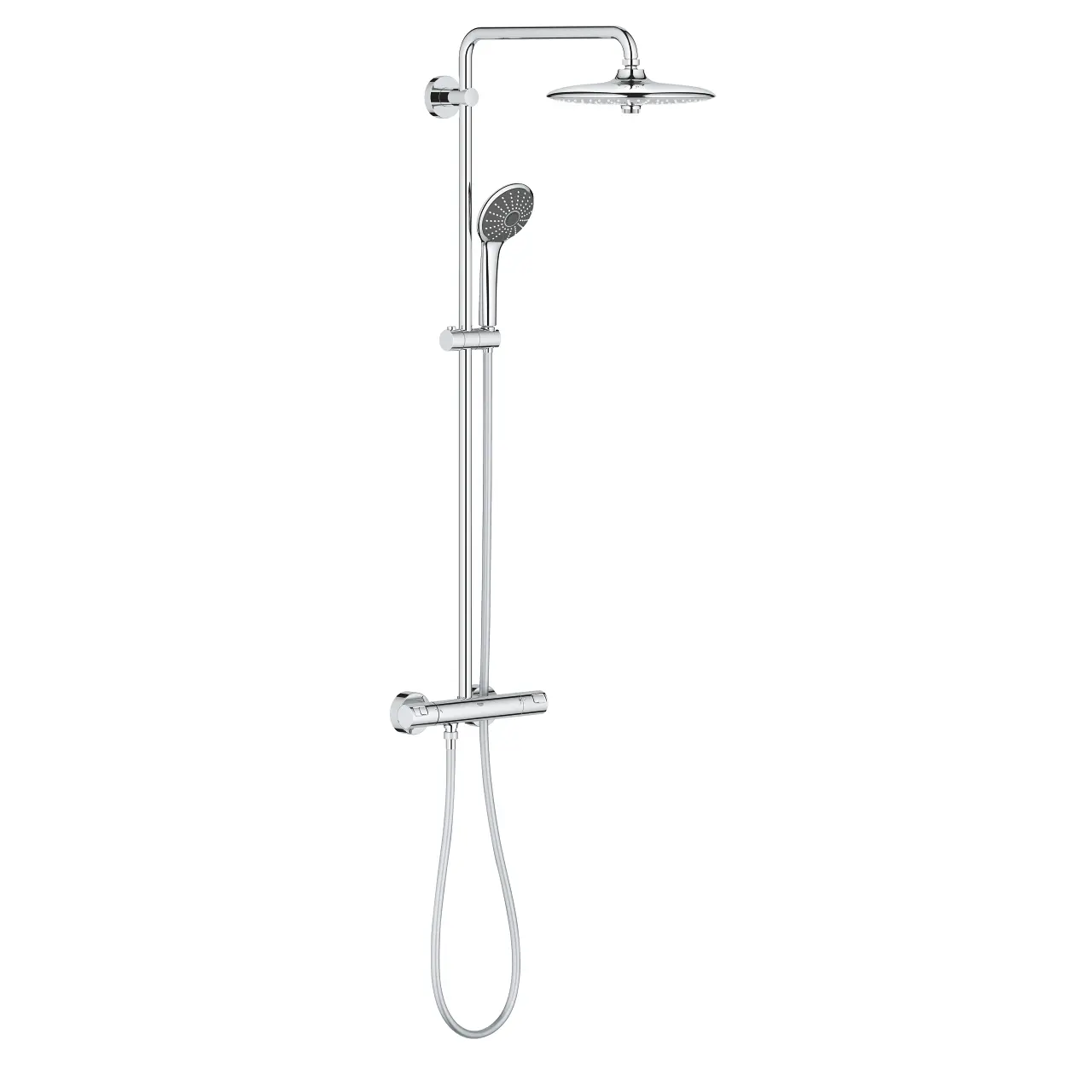"Sturtusett frá GROHE með: • 260 mm höfuðsturta ásamt handsturtu og 1750 mm sturtubarka • GROHE StarLight: Glæsilegt, skínandi útlit sem heldur sér allan endingatíma vörunnar. Krómhúðunartækni GROHE, hefur verið í þróun í 75 ár og tryggir tækjunum okkar fallega og jafna krómhúðun með einni vönduðustu yfirborðsmeðhöndlun sem til er í heiminum. • GROHE Turbostat: Hitastillirinn bregst við skyndilegum breytingi á vatnsþrýstingi á tvöföldum hraða. Þrýstingsstilltur, þægilegur og öruggur. • GROHE CoolTouch: Engin hætta á að brenna sig á heitu yfirborði. Yfirborðið verður aldrei heitara en 1 °C yfir völdu vatnshitastigi. • GROHE EcoJoy: Innbyggð vatnssparnaðartækni sem dregur úr vatns-og orkunotkun án þess að draga úr hönnun eða ánægju notandans. • GROHE DreamSpray: Njóttu þess að fara í fullkomna sturtu með hágæða tækni sem tryggir jafna og öfluga dreifingu vatns út um allan sturtuhausinn. • SpeedClean: Með SpeedClean tækninni er einfalt og fljótlegt að þrífa vöruna