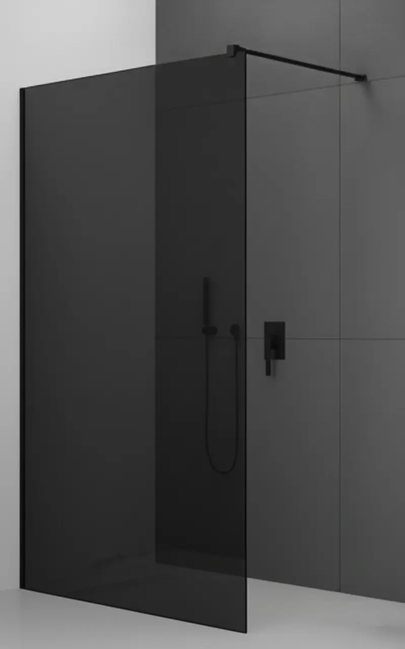 Glerþykkt 8mm, Hert öryggisgler. U prófílar við vegg og gólf. Stuðningsarmur fylgir. Graphite gler
