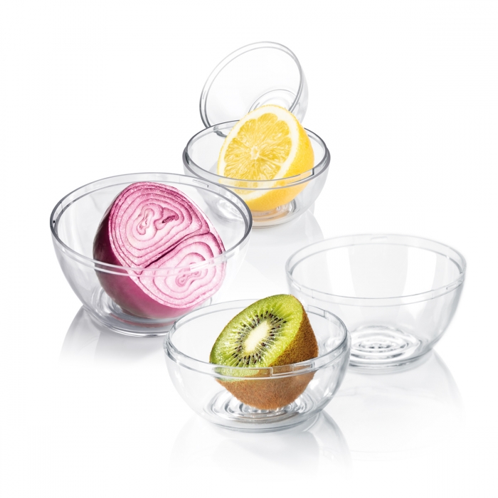 Þægilegar geymsluskálar í ísskáp með loki. Gott til að geyma í litla afganga, grænmeti og krydd. Staflanlegar og raðast vel. Gert úr endingargóðu plasti. Hentar í ísskáp, frystikistu og má fara í uppþvottavél.