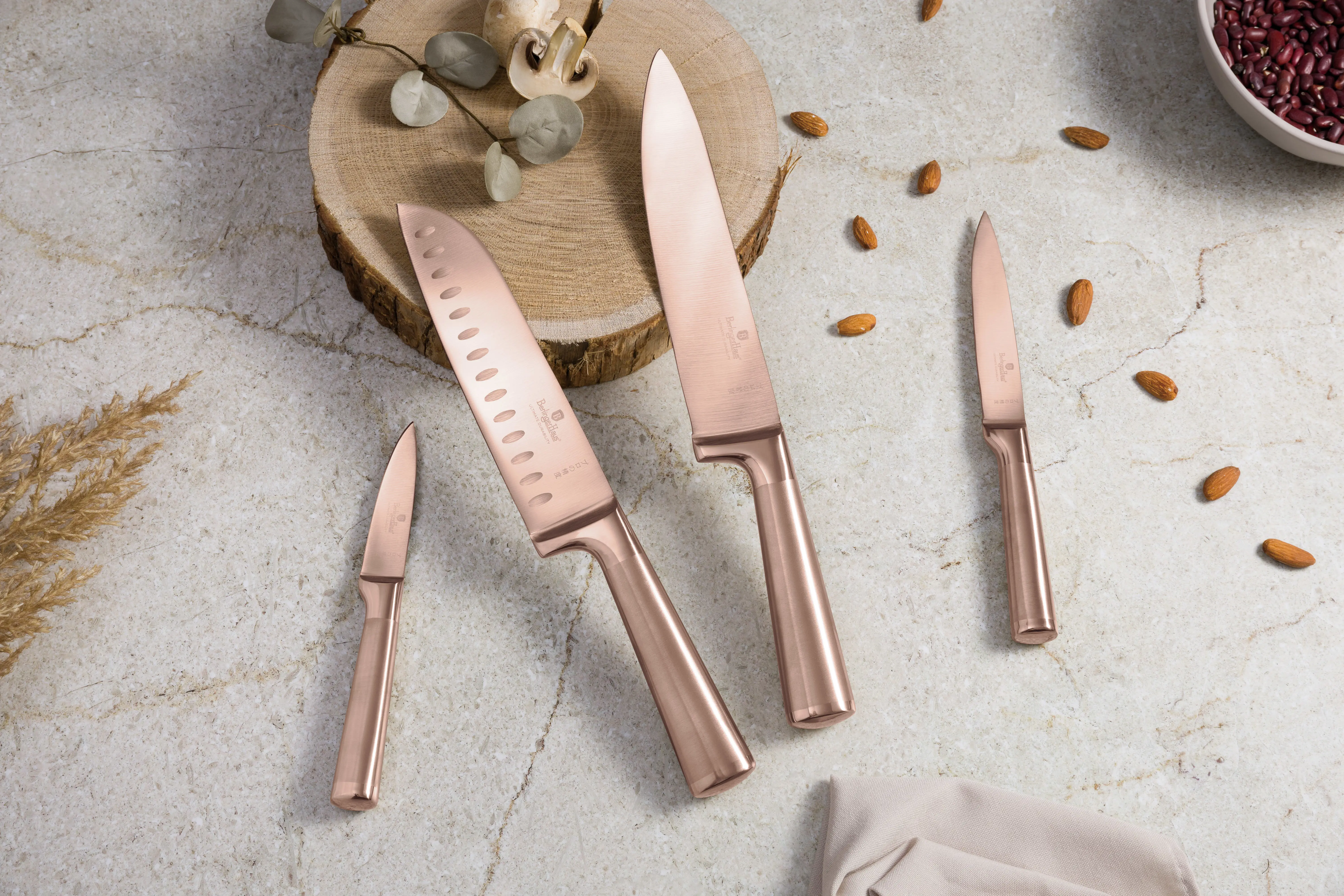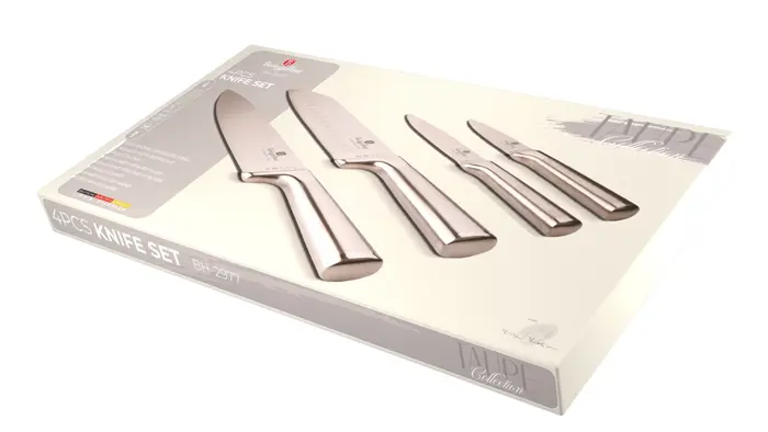 Þetta glæsilega hnífasett frá Berlinger Haus tilheyrir hinni stílhreinu Taupe-línu og sameinar fágaða hönnun og mikil notagildi. Settið inniheldur fimm mismunandi hnífa sem mæta öllum helstu þörfum í eldhúsinu, ásamt vönduðu skurðarbretti úr bambus sem hlífir eggjum hnífanna.
