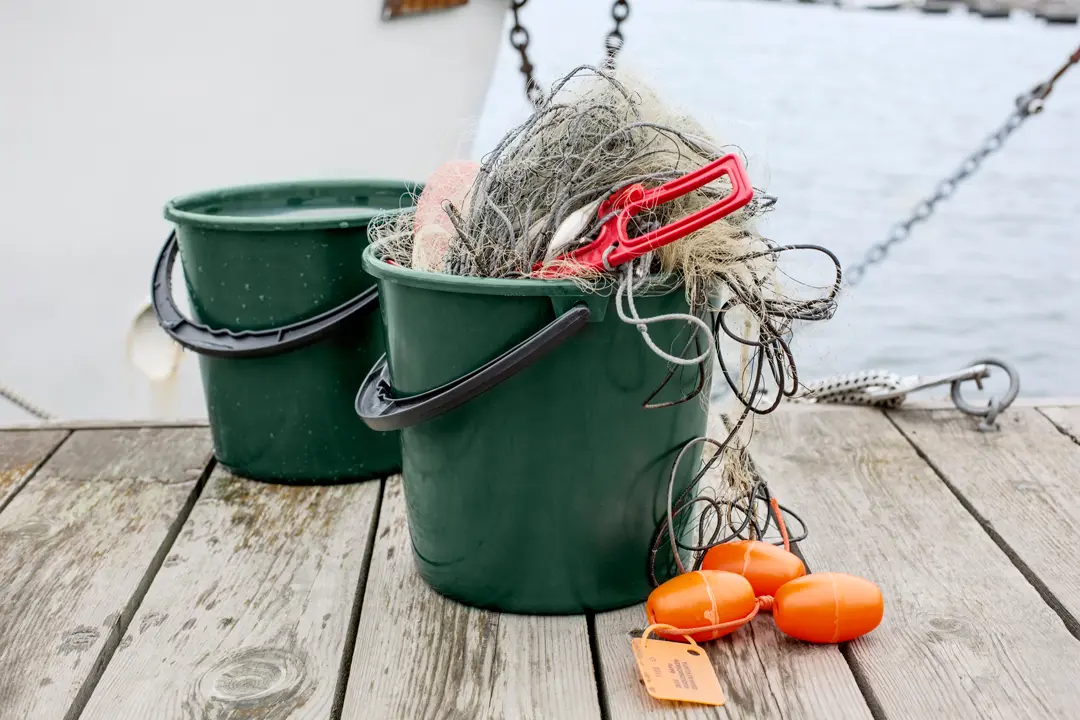 Fata unnin úr gömlum fiskinetum. Verndum hafið frá plastúrgangi með því að endurvinna og nýta.