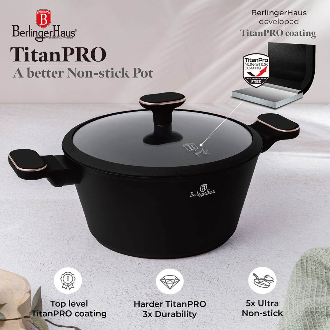 Pottur m.loki 24 sm. 24*11,8 sm. 4,1 l. Þreföld endingargóð títan non-stick húðun. Mjúkt handfang. PFOA,- blý og Kadmíum frítt. Hentar á allar gerðir helluborða. Auðvelt að þrífa.