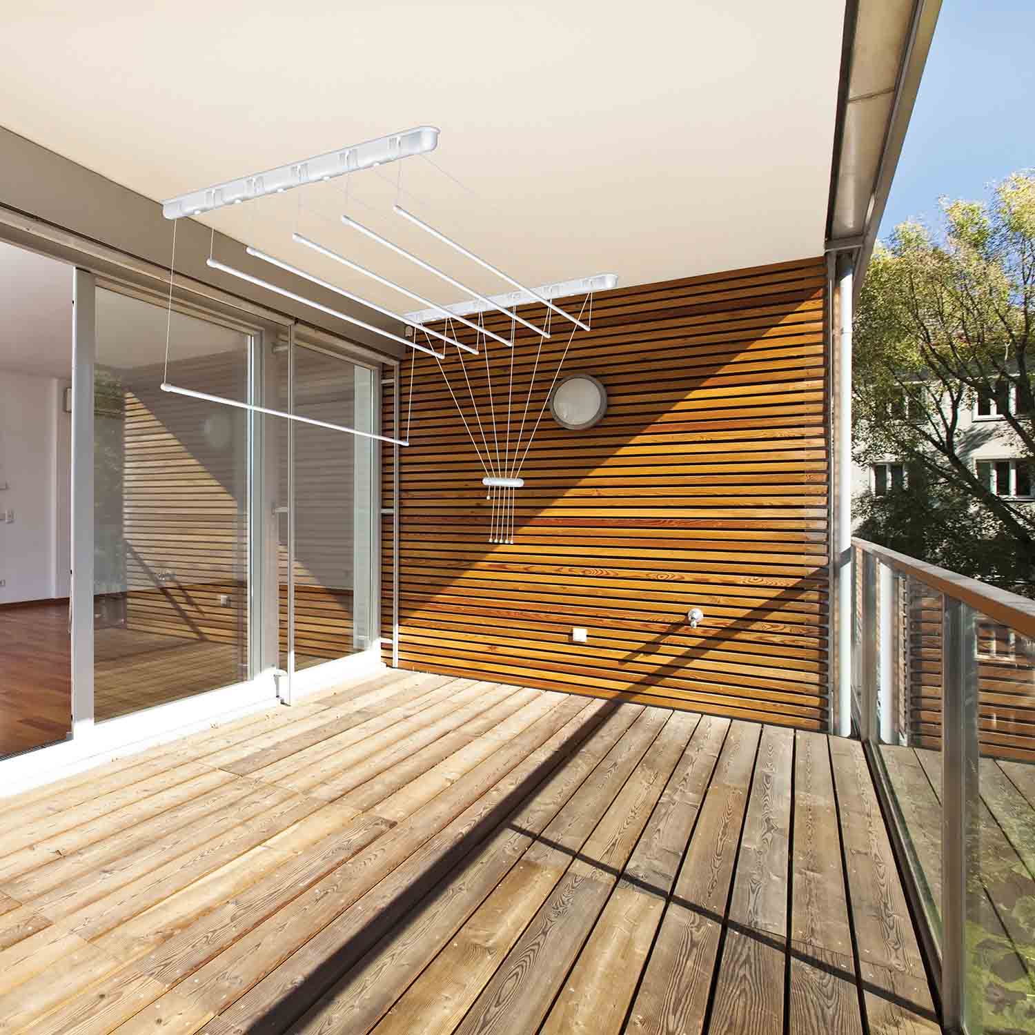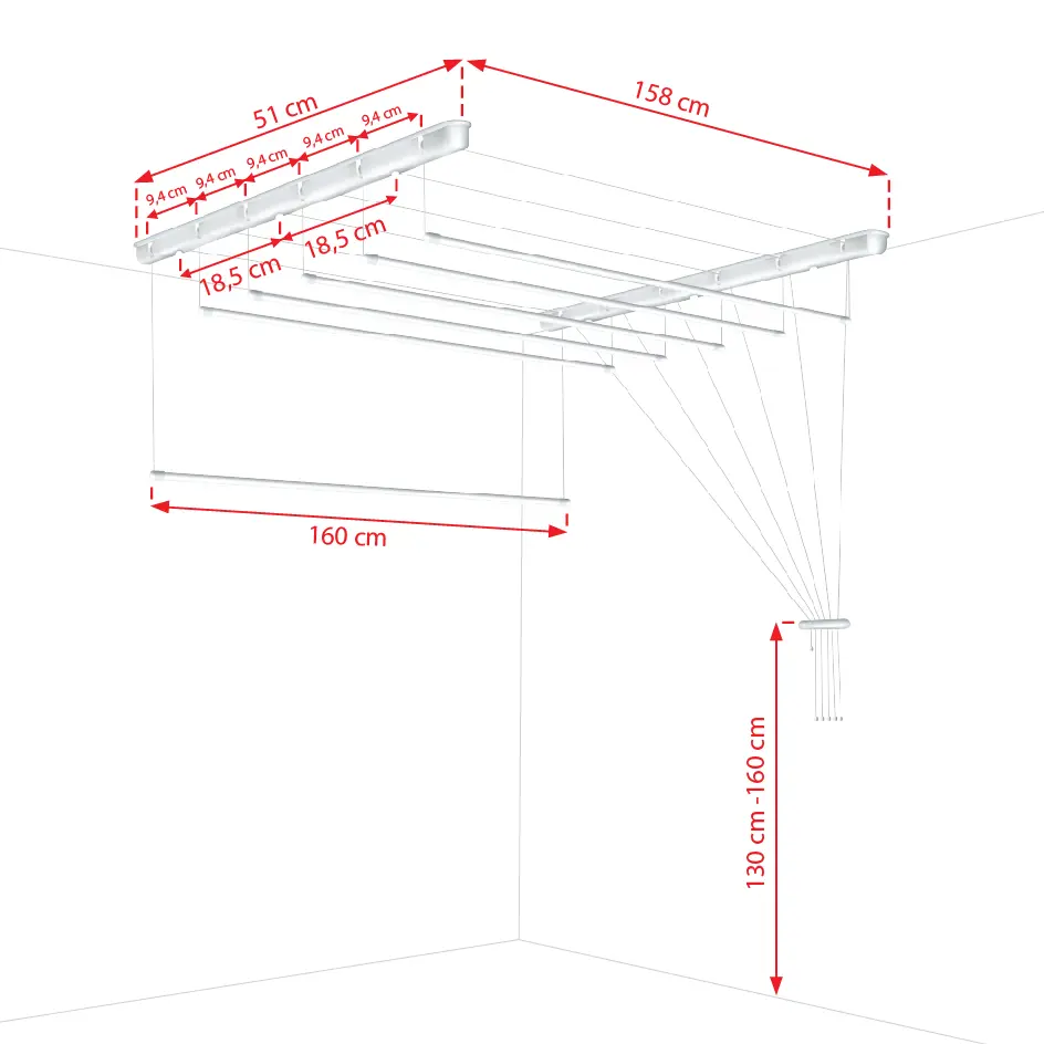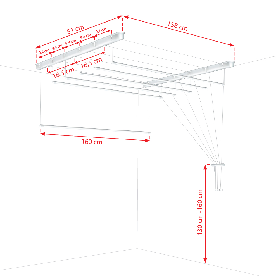 Þurrksnúrur festarî loft, hannaðar bæði til notkunar innanhúss, - og utandyra. Henta vel í þvottahús, á baðherbergi eða á verönd. 6 snúrur sem eru hver um sig 160 sm langar. Hentar fyrir herbergi sem eru ekki hærri en 3 m. Auðvelt kerfi til að lækka/hækka stöngina. Þurrkunarstöngurnar eru með streng sem áður hefur verið þræddur í gegnum sig. Stöngin er með tappa sem kemur í veg fyrir að vatn komist inn og kemur í veg fyrir tæringu. Ath. Snúrurnar eru ekki samsettar en eru einfaldar í samsetningu. Slípuð stálrör, húðuð með Pólýetyleni. Þykkt stanga 13 mm. Hámarksálag: 2 kg á hverja slá. Nettóþyngd: 2,2 kg.