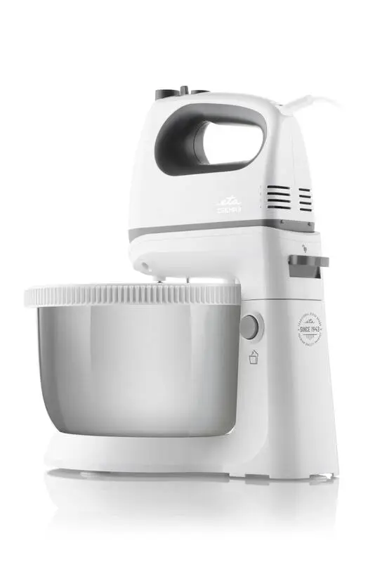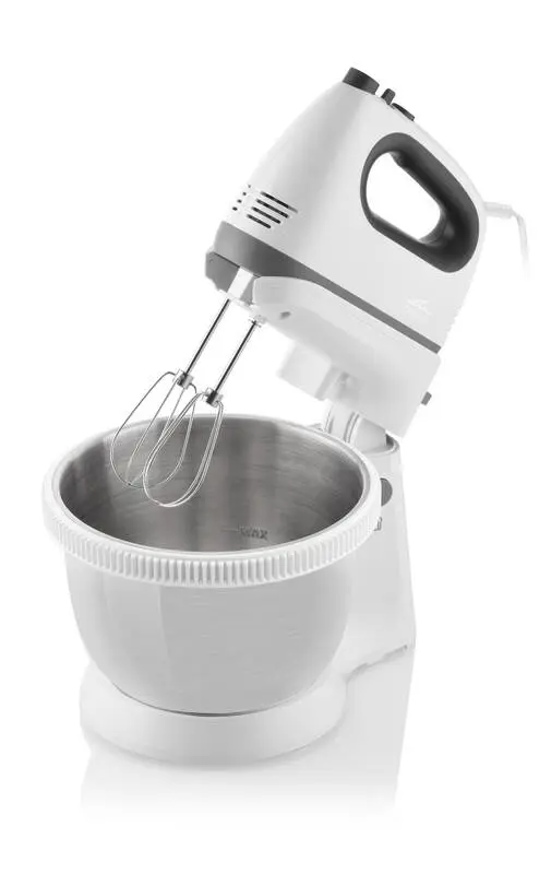 Handþeytari með skál. Afl 400W, 5 hraðastillingar. Skál úr ryðfríu stáli, 3,6 ltr. Snúra 1 metri.