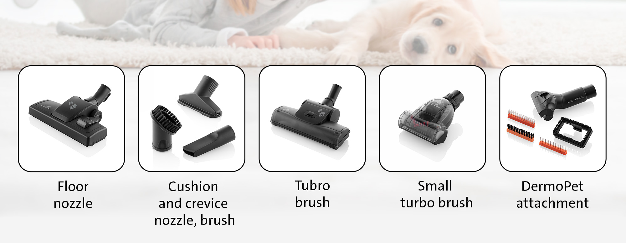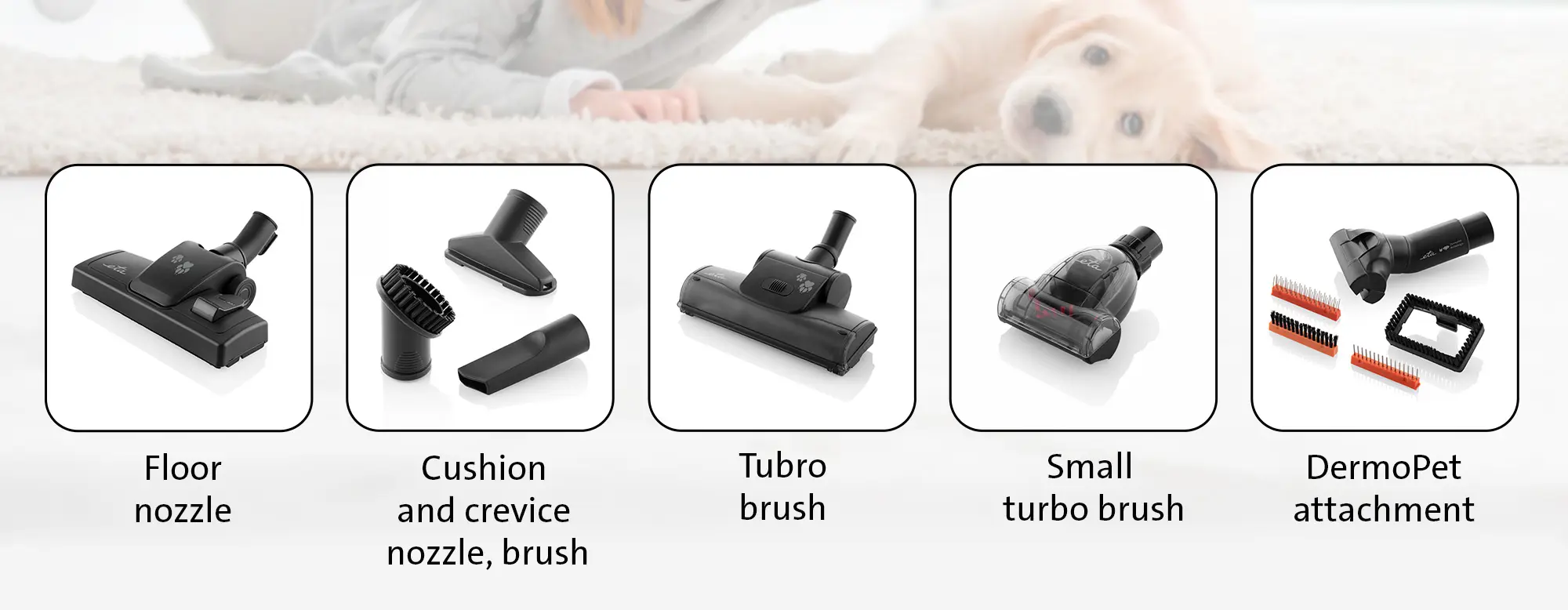 Einn helsti kostur þessarar ryksugu er hið mikla úrval aukahluta sem fylgir. Þar má nefna sérstakt DermoPet viðhengi fyrir feldhirðu sem gerir kleift að snyrta gæludýrið og sjúga upp laus hár um leið. Einnig fylgja öflugir túrbóburstar í tveimur stærðum sem eru sérstaklega skilvirkir við að ná upp dýrahárum úr teppum og áklæðum.