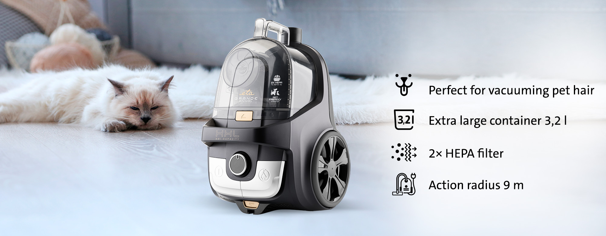 ETA Grande Animal er öflug og pokalaus ryksuga sem er sérhönnuð til að mæta þörfum gæludýraeigenda. Með 850W afli og tvöfaldri síun tryggir hún öflugt sog og hreint loft við útblástur. Vélin er hönnuð til að auðvelda þrif á heimilum þar sem dýrahár geta verið vandamál og býður upp á sérhæfðar lausnir fyrir bæði gólf og húsgögn.