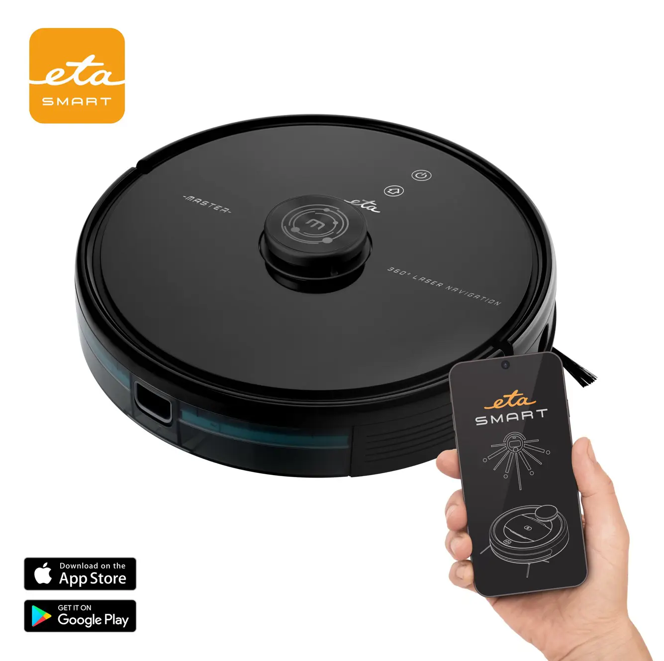 Snjöll leysileiðsögn kortleggur herbergið í fullri 360°. Þökk sé þessu verða heimilisþrif þín mun ítarlegri og skilvirkari . Með 9,7 cm hæð, passar hann þægilega jafnvel undir neðri húsgögn . Slitsterk hjól með drifi vinna bug á ójöfnum og jafnvel allt að 1,5 cm háar skiptingar eru ekkert vandamál . Eftir ryksugun getur ETA Master II einnig þurrkað gólfið . Þú getur auðveldlega stillt styrk raka í forritinu í samræmi við núverandi þarfir þínar. Það getur þurrkað allt að 100 m2 svæði á hverri fyllingu . Innbyggði UV lampinn mun einnig stuðla að fullkomnu hreinleika , sem sótthreinsar gólfið og gerir heimilið tandurhreint. Búinn frábæru minni. Það getur skannað og vistað allt að 5 kort , sem gerir það tilvalið fyrir fjölbýlishús. Á hverri hæð er einnig hægt að setja bönnuð svæði sem ætti að forðast. Veldu úr 5 hreinsunarstillingum . Ef ryksugan verður rafmagnslaus við hreinsun leitar hún sjálfkrafa að hleðslustöð og heldur áfram nákvæmlega þar sem frá var horfið að hleðslu lokinni . 3 í 1: getur ryksugað, þurrkað og sótthreinsað gólfið Hágæða Li-Ion rafhlaðan endist allt að 230 mínútur af samfelldri hreinsun Snjöll leysileiðsögn tryggir fullkomna leiðsögn um gólfflötinn ETA SMART forrit fyrir þægilega stjórn með farsíma AUTO BOOST tæknin mun sjálfkrafa auka sog á teppum eða þegar þau eru mjög óhrein ULTRASONIC CARPET DETECTION skynjar teppi og forðast þau ANTI-COLLISON kerfið fylgist með hindrunum og tryggir mjúkar hreyfingar í herberginu SMART TÆKNI mun vernda vélmennið frá því að detta niður stigann