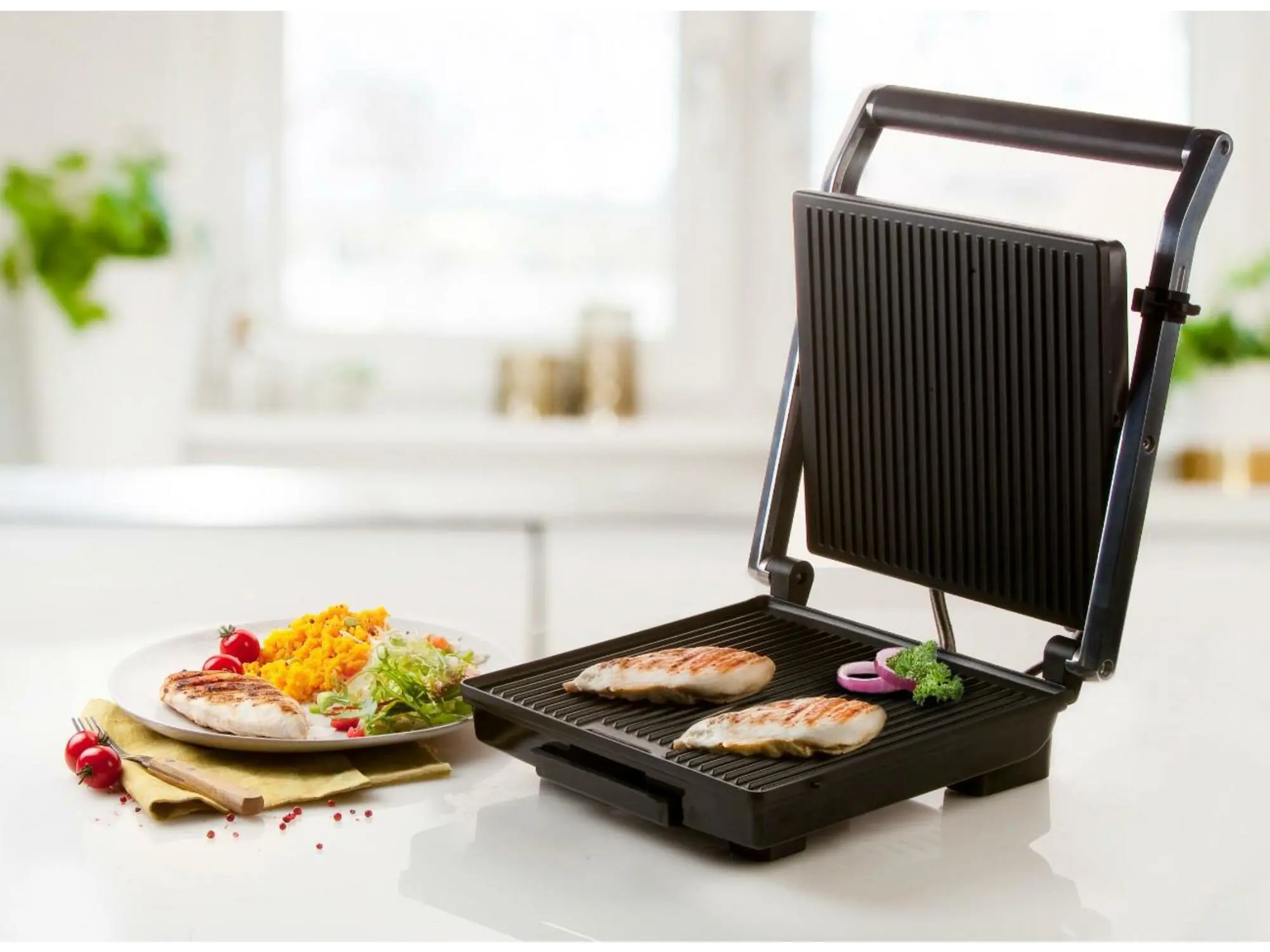 Fullkomið til að grilla panini, kjöt, fisk, grænmeti osfrv. Teflon non-stick húð. Lok sem aðlagast sjálfkrafa að innihaldinu. Ryðfrítt stál. Stillanlegur hitastillir. Dropbakki fyrir umfram fitu. Er 2000W.