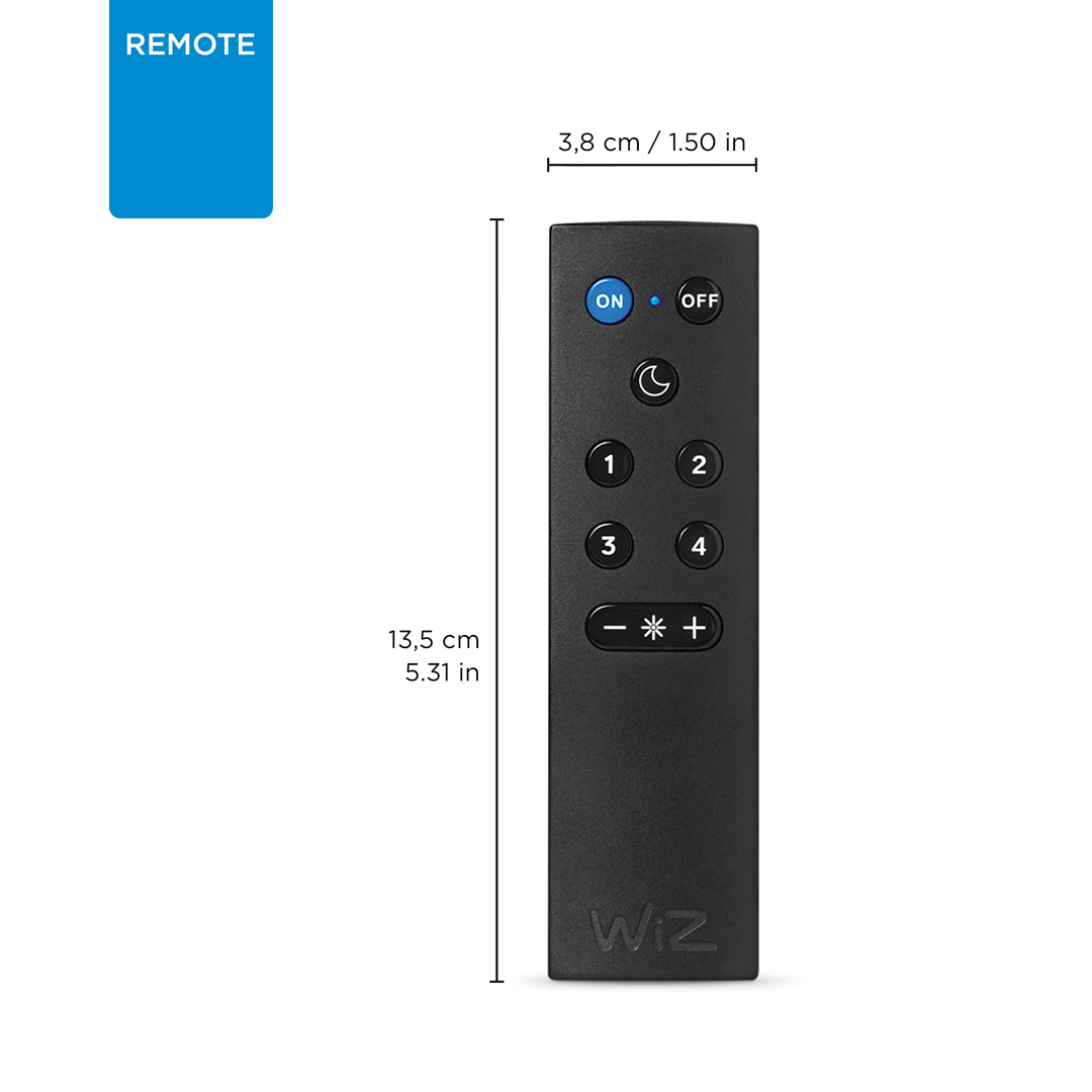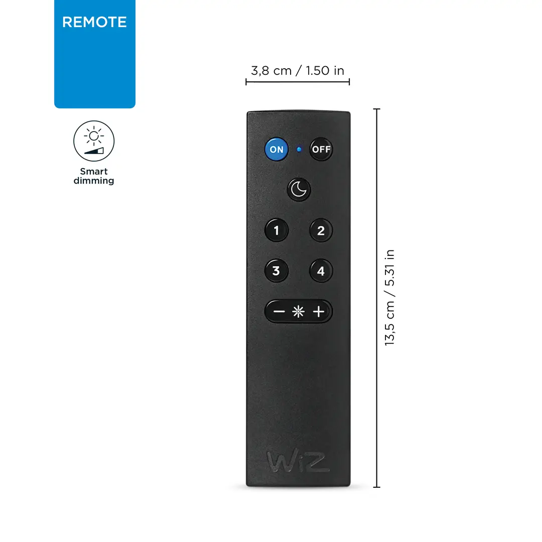 Fjarstýring fyrir WiZ ljós. Stýrðu öllum ljósum í einu herbergi með þessari einföldu fjarstýringu. Kveikja, slökkva, stilla birtu eða stilla eftir mismunandi tímum sólarhrings. Dregur allt að 15 metrum. Virkar þí að Wi-fi liggi niðri. Virkar með öllum WiZ vörum. Efni:Plast Mál:1,5*3,8*13,5 IP staðall IP20