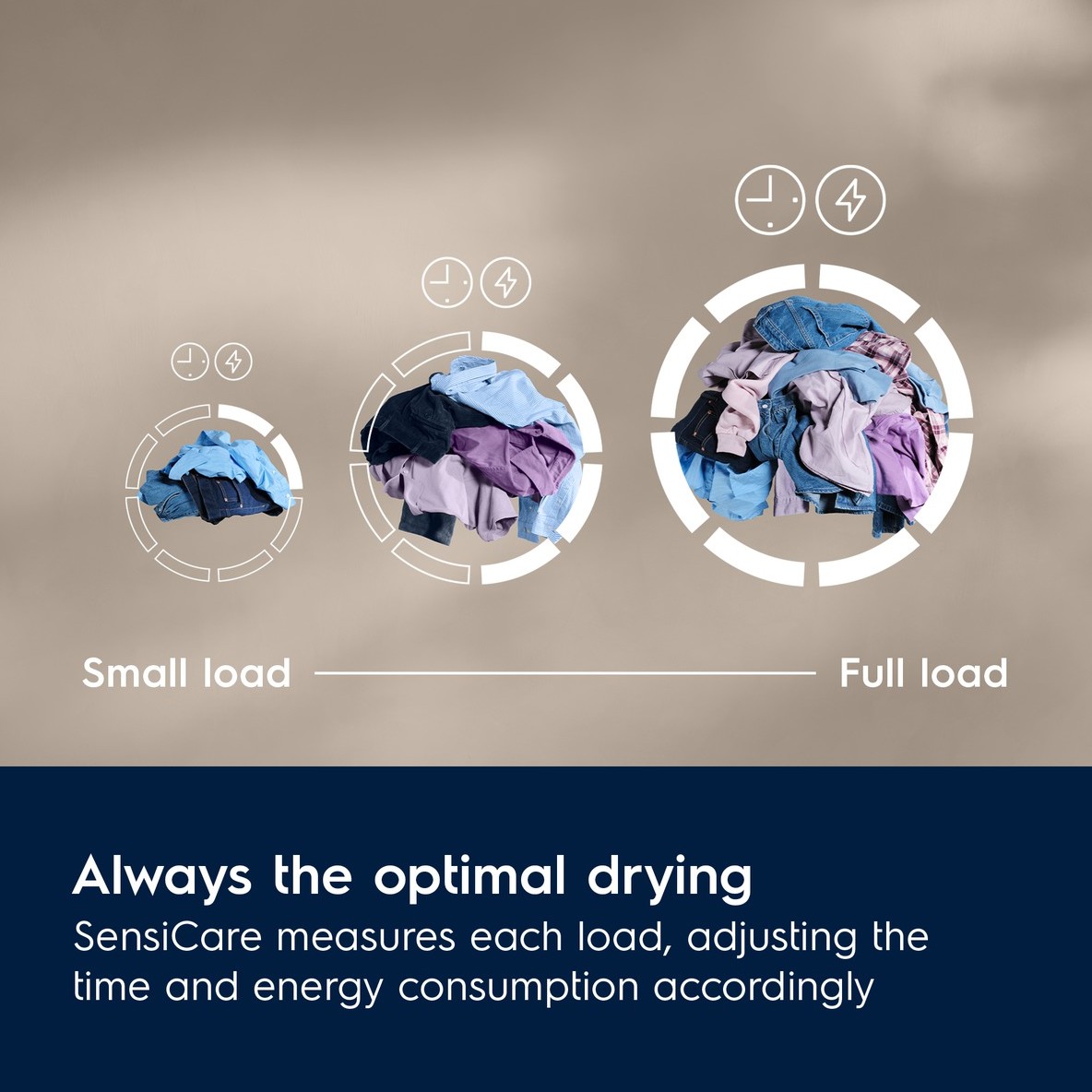 - SensiCare: Skynjar rakastig í tromlunni og stillir þurrktímann sjálfkrafa til að vernda fötin og spara orku.