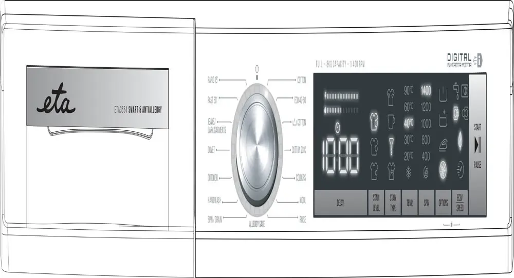 - Viðbótaraðgerðir: Seinkuð ræsing, val á styrkleika og tegund bletta, val á þvottahita og snúningshraða, forþvottur, auka skolun, auðvelt að strauja, ofnæmisvörn, val um hagkvæman eða hraðan þvott