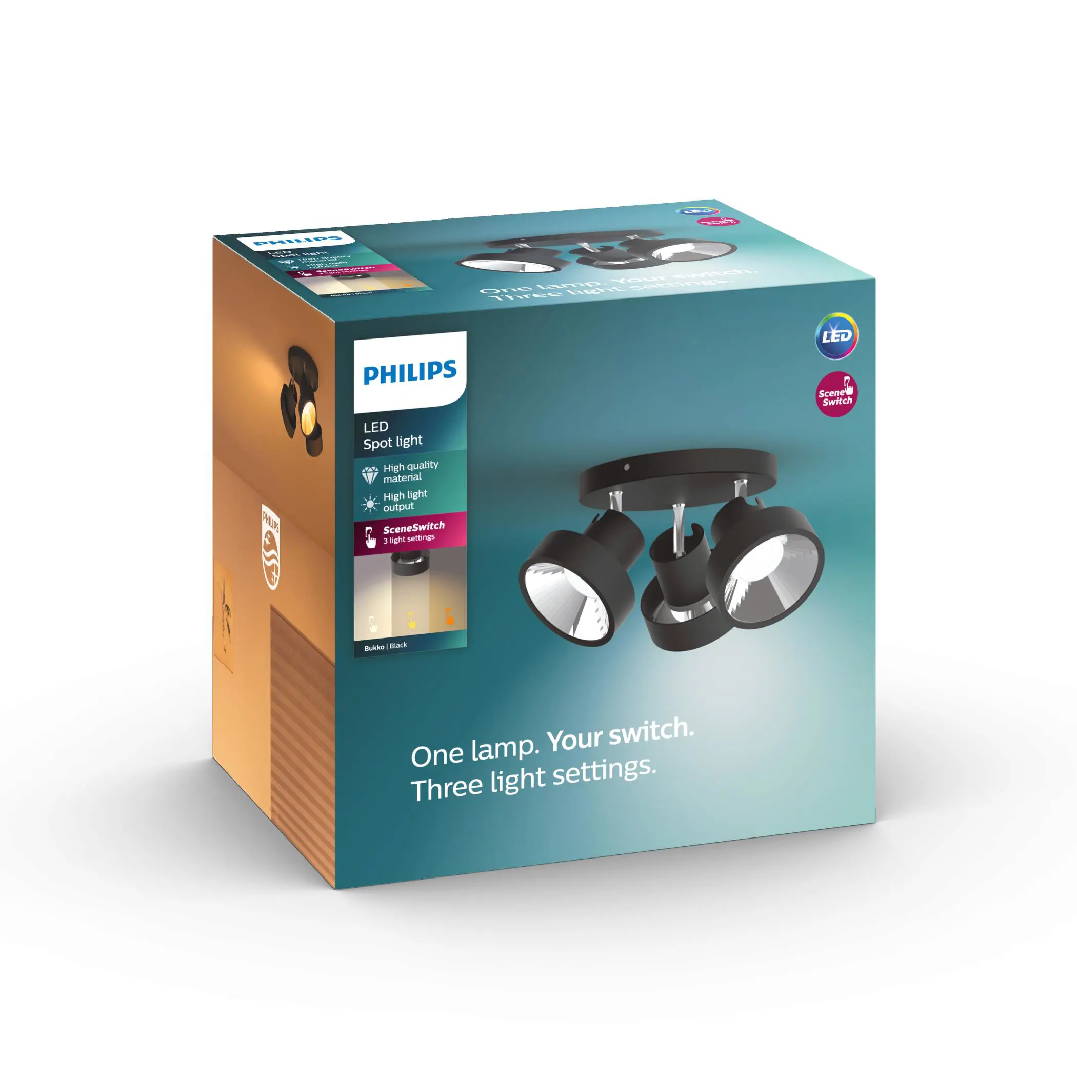 Þrefaldur BUKKO kastari býður upp á fjölhæfa lýsingu með þrjú lýsingarstig. LED perur tryggja orkusparnað og eru með langan endingartíma. Auðvelt er að breyta um stillingu með einföldum rofa. Tæknilegar upplýsingar: - 12.9W LED - 1290 lm - 2700K - Líftími: 25.000 klst. - SceneSwitch þrjár lýsingarstillingar Helstu eiginleikar: - Þreföld lýsing - SceneSwitch fyrir mismunandi birtu - Langur endingartími Fylgihlutir: Engir fylgihlutir