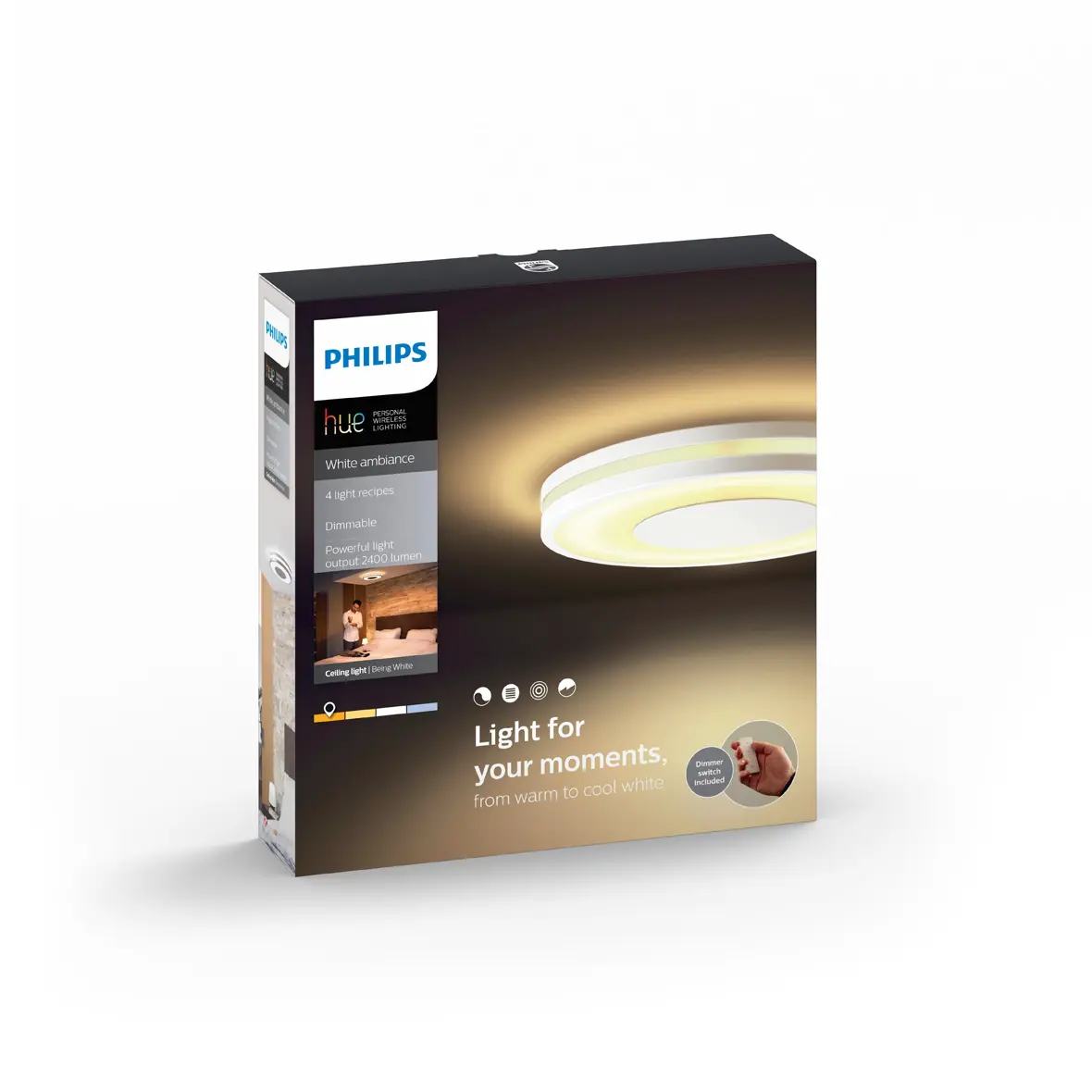 Loftljós frá Philips HUE, hægt er að breyta lýsingu bæði í appi og með fjarstýringu, litasvið í perunum er 2200-6500 kelvin. Dimmanlegur - Já (í appi) Afl 20W Ljósmagn 2350lm (á 400K) Litarhitastig 2200-6500K Varnarflokkur IP20 að neðan Líftími 25.000 klst Breidd 35 cm Hæð 5 com