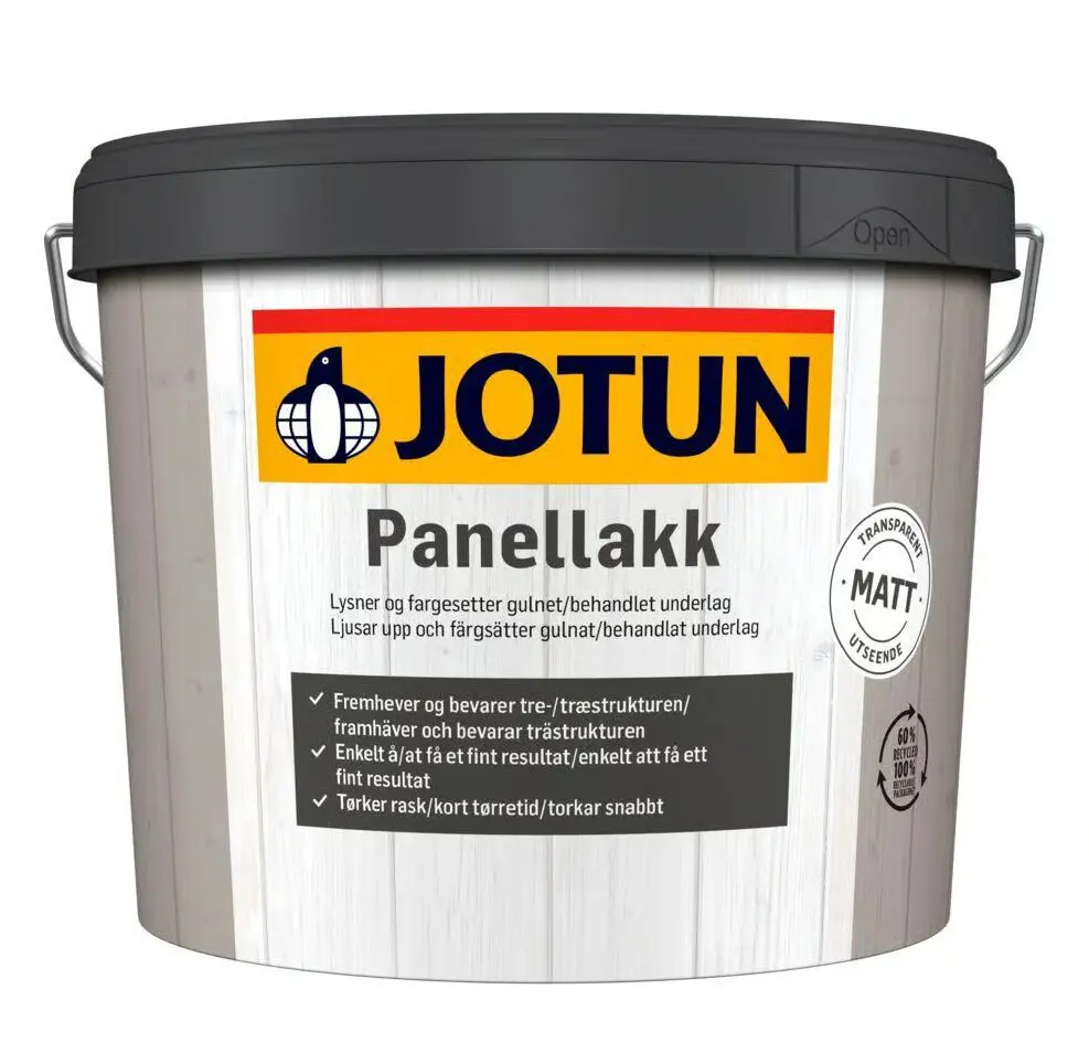 Jotun Panellakk er vatnsbaserað glært lakk til innanhús nota. Aðallega ætlað á panelklædda veggi og loft (ekki á gólf!). Gefur matta, og náttúrulega áferð sem skerpir á áferð viðarins. Inniheldur ljósfilter sem dregur úr gulnun. Situr vel í pensli og þægilegt í meðhöndlun. Þornar fljótt. Gætið að blanda saman dósum með mismunandi framleiðslunúmerum til að forðast litamismun. Notkun : Berið á með pensli. Á panel skal gæta að bera aldrei meira en 1-2 borð í einu, þá alla lengd til enda. Lítri þekur 10-12 fm í umferð. Snertiþurrt eftir 1 klst. Yfirmálun eftir 2 klst. Notið pensla, má alls EKKI sprauta. Þrif á áhöldum er með volgu vatni og penslasápu.