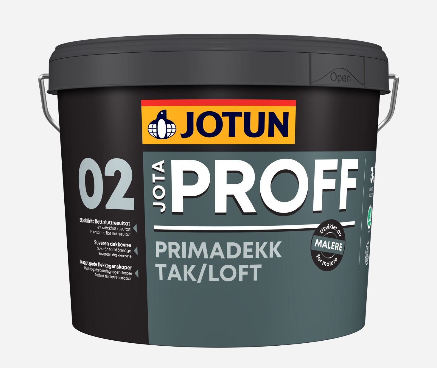 Jotaproff Primadekk 02 er úrvals loftamálning sem er sérstaklega hönnuð fyrir fagaðila og kröfuharða notendur. Hún gefur alveg matta áferð (gljástig 02), sem tryggir að yfirborðið sé glitlaust óháð því hvaðan birtan kemur, sem er sérstaklega mikilvægt á stórum loftflötum.