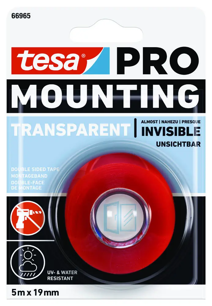 Sterkt og endingargott: hitaþolið allt að 100 °C til lengri tíma litið, ónæmt fyrir skemmdum af völdum raka, (ákveðnum) efnum, mýkingarefnum og UV-ljósi * Næstum ósýnilegt: Gegnsætt borðið festist við slétt yfirborð eins og gler, flísar, viður og ýmsar plasttegundir * Tilvalið til notkunar inni og úti