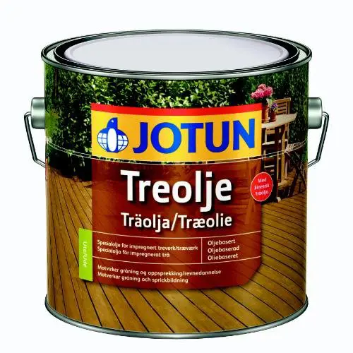 Jotun Treolje er olía sérstaklega ætluð á gagnfúavarið timbur (palla og húsgögn). Er mjög vatnsfráhindrandi og kemur í tveimur tilbúnum litum ásamt hægt að fá litaða í fjölmörgum litum. Ver gegn gráma af völdum sólarljós og að viðurinn springi. Jotun Treolje er tilbúin til notkunar, blandið saman dósum með ólík framleiðslunúmer til að hindra litamismun. Undirflötur skal vera hreinn og þurr. Nýtt gagnfúavarið timbur er gott að láta jafna sig í 1-2 mánuði. Útfellingar skal hreinsa með stífum bursta, skolið vel af með vatni og leyfið að þorna. Gamalt gagnfúavarið timbur : gráma skal fjarlægja með stálbursta eða slípa. Olíuborið timbur skal þrífa með Trebitt Terrassefjerner. NOTKUNARLEIÐBEINGAR : Berið á 1-2 viðarborð til enda, þurrkið umframm olíu af með klút eða tusku. Olían á að ganga í timbrið, ekki mynda filmu. Bera enda skal metta vel. Hægt er að nota pensla eða rúllu. Notið Jotun White Spirit (terpentína) eða penslasápu til að þrífa pensla og rúllur. VIÐHALD : Hægt er að nota Jotun Husvask 2-in-1 til að þrífa pallinn og fríska hann upp. ATHUGIÐ AÐ GLÆR PALLAOLÍA VER EKKI GEGN GRÁMA.