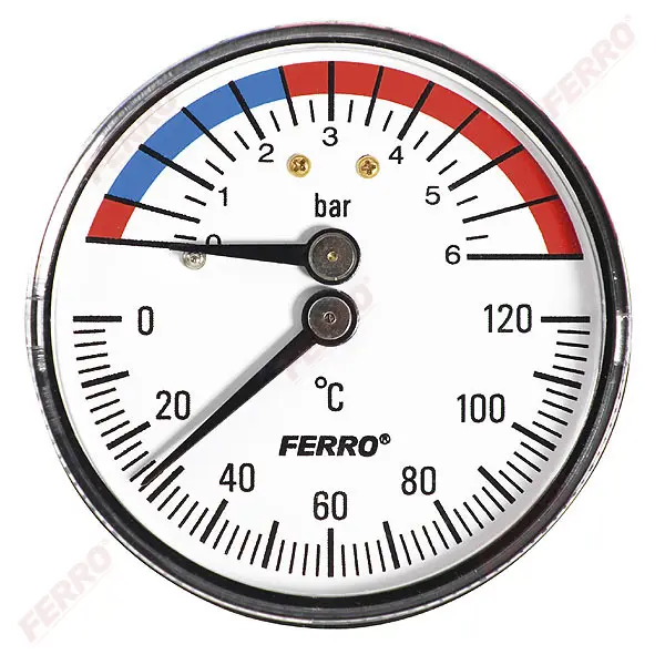casing: high resistance ABS cover: synthetic material resistant to cracking dial: powder coated aluminium mechanism: Bourdon spring manometer thermometer: bimetallic spiral connector: brass 1/2” back temperature range: 0-120°C pressure range: 0-6bar dial diameter: 63mm