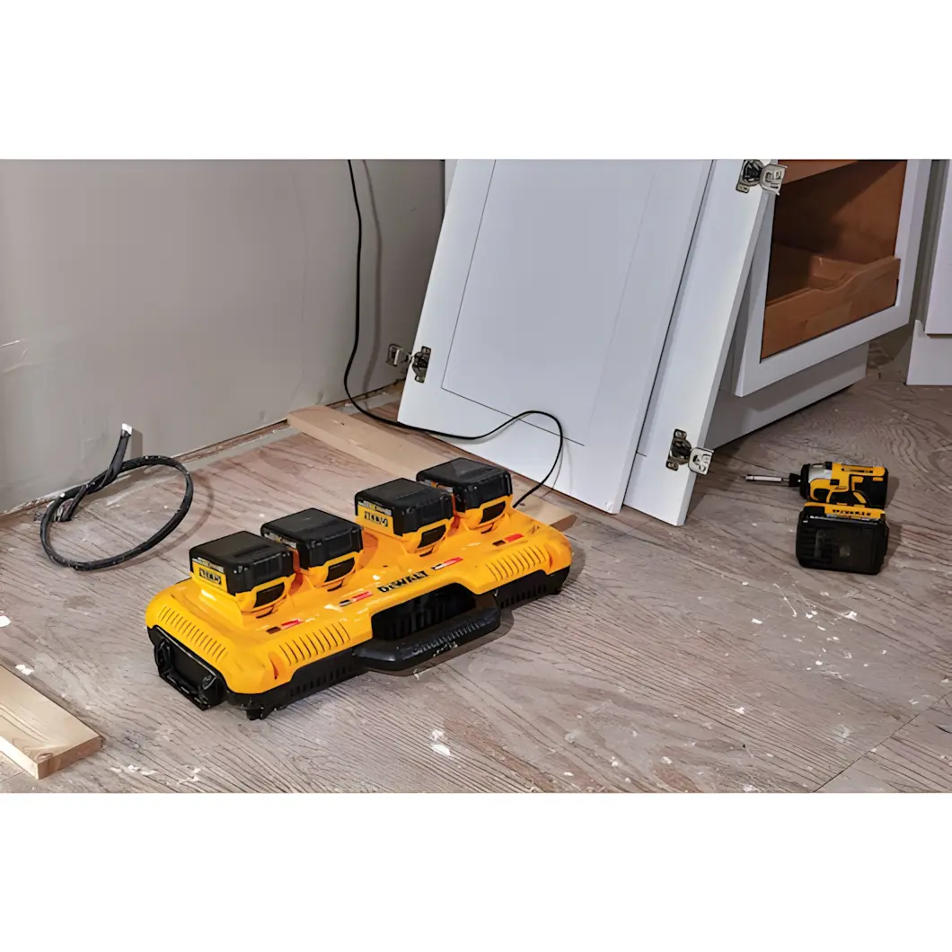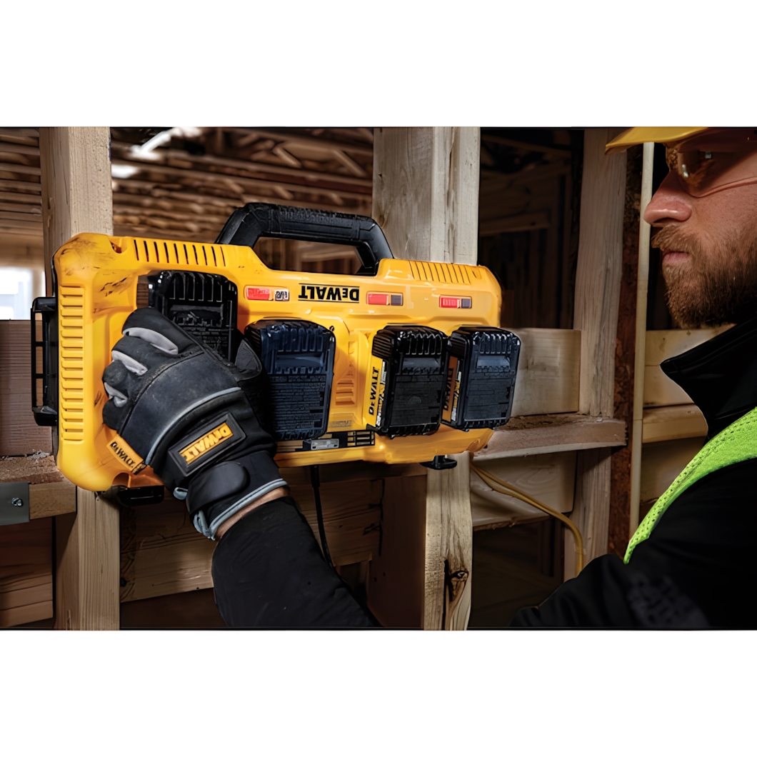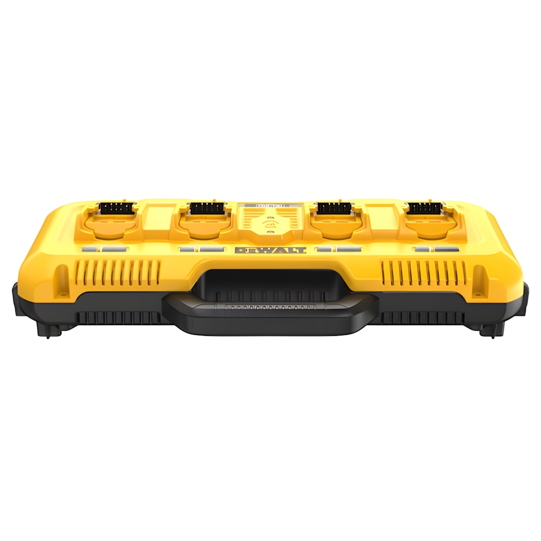 DeWalt DCB104 er fullkomin lausn fyrir verkstæðið og vinnusvæðið þar sem þörf er á mikilli orku. Þessi fjórfalda hleðslustöð getur hlaðið fjórar rafhlöður samtímis, óháð því hvort þær eru 10.8V, 12V, 18V XR eða 54V FLEXVOLT. Hver tengill gefur 8 amper, sem þýðir að stöðin deilir ekki straumnum heldur gefur fullt afl á alla póla í einu.