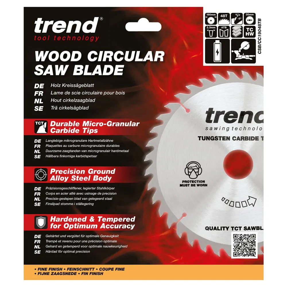 Trend CSB/CC19048TB er hágæða hjólsagarblað með 48 TCT-tönnunum, hannað fyrir fínan og nákvæman skurð í tré og plötuefni. Þunnt skurðspor (1,6 mm) dregur úr mótstöðu, sparar orku og lengir rafhlöðuendingu í rafhlöðuknúnum sögum. Hitadreifandi göt lágmarka titring og hitauppsöfnun þannig að blaðið heldur lögun sinni og skilar stöðugum skurði.