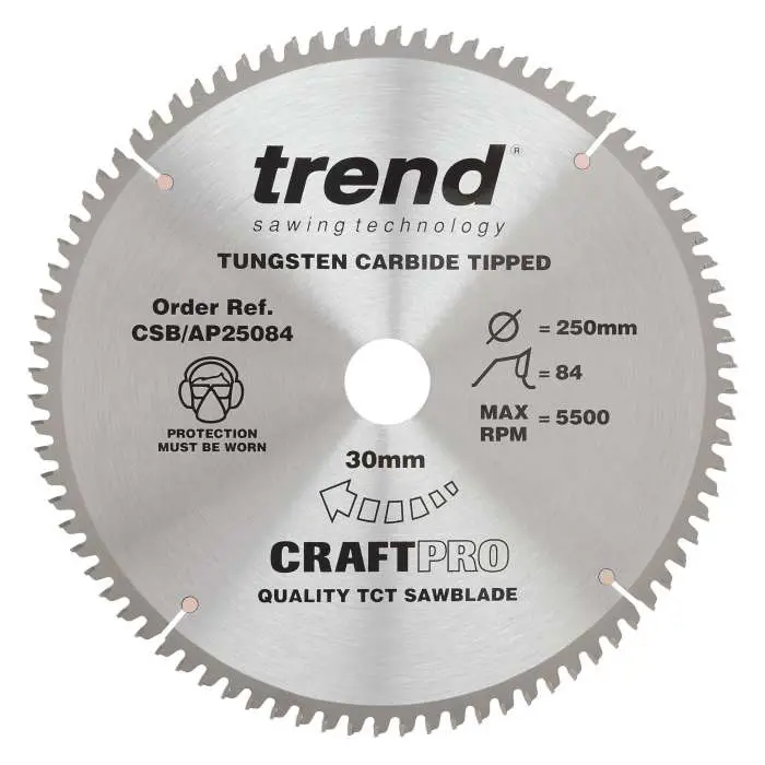 range of Tungsten Carbide Tipped Circular Sawblades designed for a professional finish in plastic & alloy. Reamed bore to ensure precise fit to spindle. Silverbraze to ensure tip is bonded securely to body. Body hardened and tempered to maintain trueness. Laser etched on reverse to European standard EN847-1/2. The Trend name for traceability and a guarantee of quality. High grade alloy steel palate body precision ground to maintain flatness. For alloy cutting use a cutting lubricant such as Trendiwax. Wear gloves and clamp material securely.