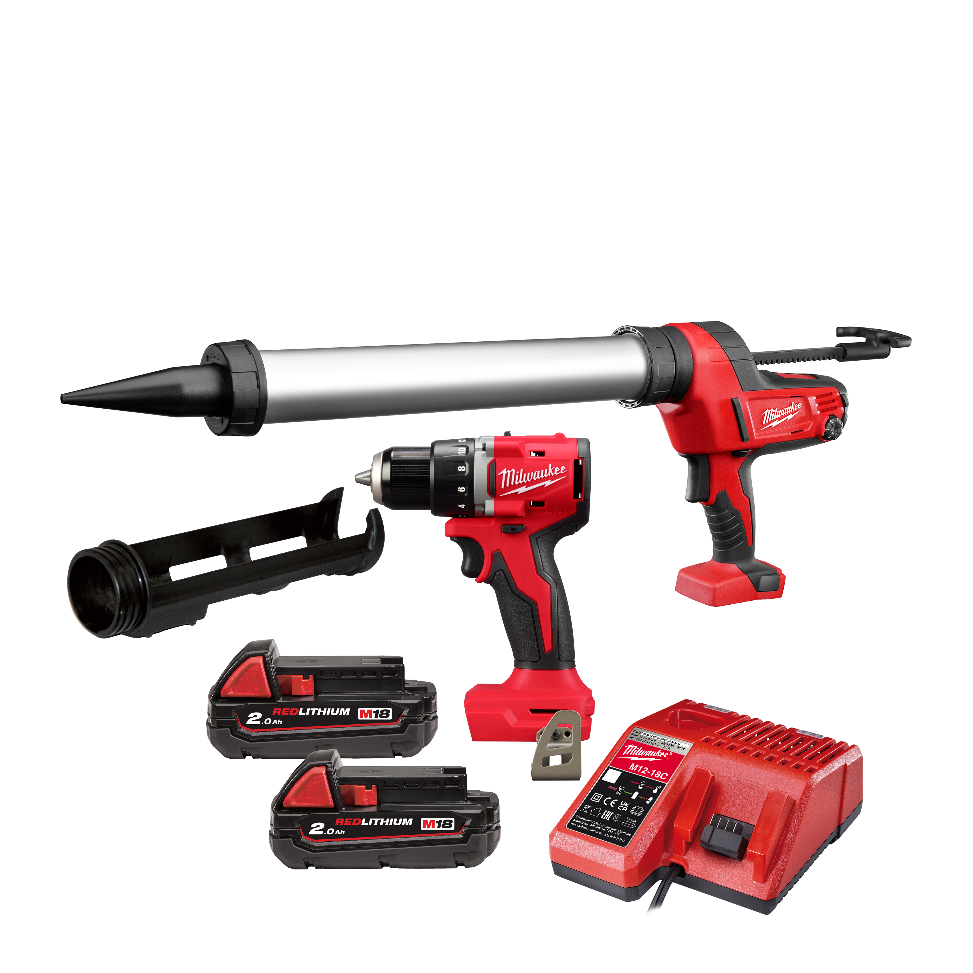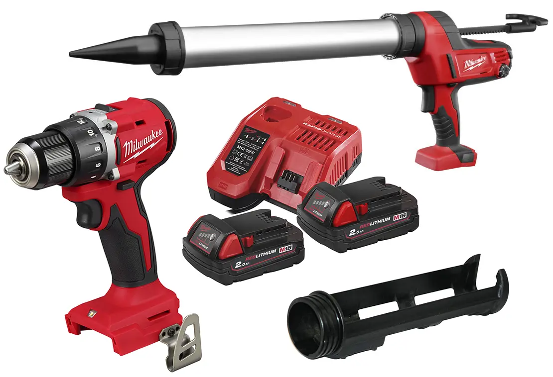 Sett 18V Borvél og kíttisgrind Milwaukee BPP2T-202 2x2.0Ah